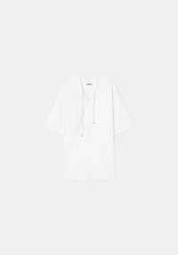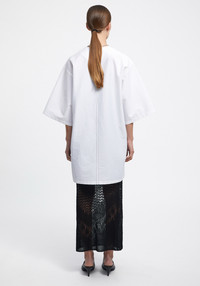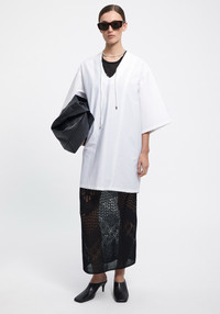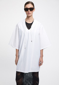 Our CHAPMAN poplin midi dress is made of a crispy cotton blend. This piecehas a relaxed fit and features contrast stitching on the drawstings and back. It has an effortless silhouette, perfect for a casual everyday look or over beachwear. Size and Fit Designed for a loose fit, in case you do not prefer an oversized look take one size smaller than usual. The model is 180 cm and wears a size 36. Fabric and Care 89% Cotton 11% Polyamide Do not wash, Do not bleach, Do not tumble dry, Iron low temperature, Suitable for dry cleaning, Suitable for professional wet cleaning