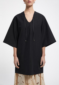 Our CHAPMAN poplin midi dress is made of a crispy cotton blend. This piece has a relaxed fit and features contrast stitching on the drawstings and back. It has an effortless silhouette, perfect for a casual everyday look or over beachwear. Size and Fit Designed for a loose fit, in case you do not prefer an oversized look take one size smaller than usual. The model is 180 cm and wears a size 36. Fabric and Care 89% Cotton 11% Polyamide Do not wash, Do not bleach, Do not tumble dry, Iron low temperature, Suitable for dry cleaning, Suitable for professional wet cleaning