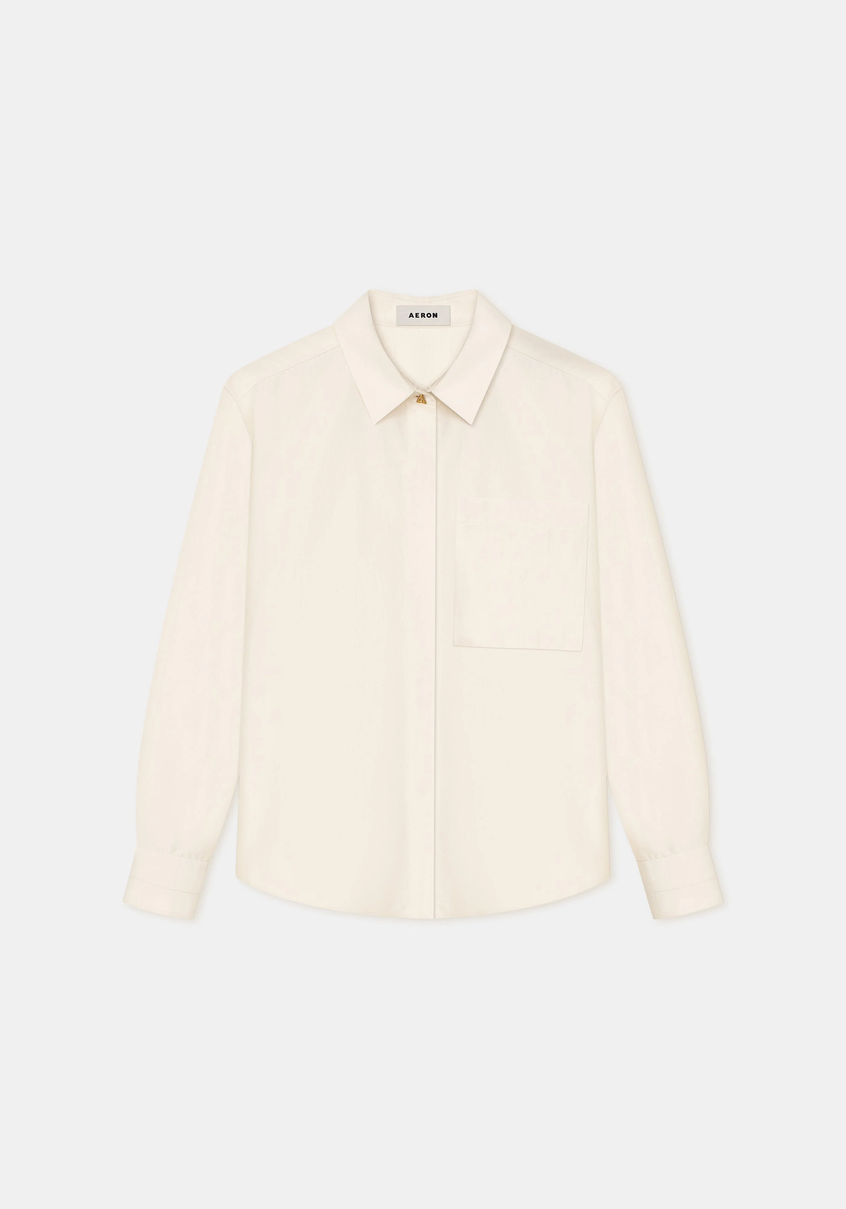 Our FLINT crispy poplin shirt is crafted from a cotton blend. This piece has a classic oversized silhouette, refined by a curved hemline. This piece is finished with a concealed button fastening to keep its minimalist look, while a small A-motif button is added at the collar. Size and Fit Designed for a loose fit, take your normal size. The model is 178 cm and wears a size 36. Fabric and Care 89% Cotton 11% Polyamide Do not wash, Do not bleach, Do not tumble dry, Iron low temperature, Suitable for dry cleaning, Suitable for professional wet cleaning