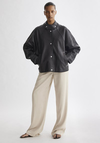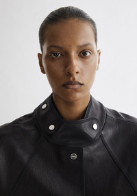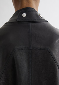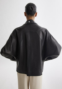 Our SALEM moto jacket is crafted from buttery-soft lambskin leather sourced from traceable origins. Designed with a ’90s-inspired, oversized silhouette, it features sculptural batwing sleeves that bring volume and presence. It features a distinctive neck detail with a structured, snap-fastened band that lends a modern, utilitarian edge while framing the neckline with intention. Finished with refined paneling and smooth lines, it offers a bold yet understated take on contemporary leather outerwear. Fabric and Care 100% lambskin leather; Lining: 100% viscose Do not wash, Do not bleach, Do not tumble dry, Do not iron, Do not dry clean, Consult with leather specialist