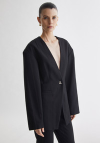 Our SOMERSET collarless waisted blazer is defined by a clean, elongated line that sharpens its modern, minimalist silhouette. Subtle tonal stripes run through the fabric, adding quiet dimension while maintaining its refined simplicity. Gentle waist shaping brings structure to the body, and the collarless design keeps the look crisp and architectural. Finished with our signature A-button, it’s a polished, versatile piece that transitions effortlessly between settings. Fabric and Care 64% polyester, 35% viscose, 1% elastane; Lining: 100% viscose Do not wash, Do not bleach, Do not tumble dry, Iron at low temperature, Dry clean