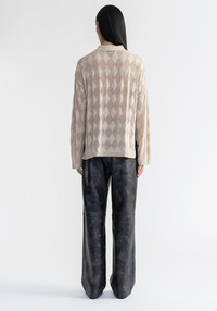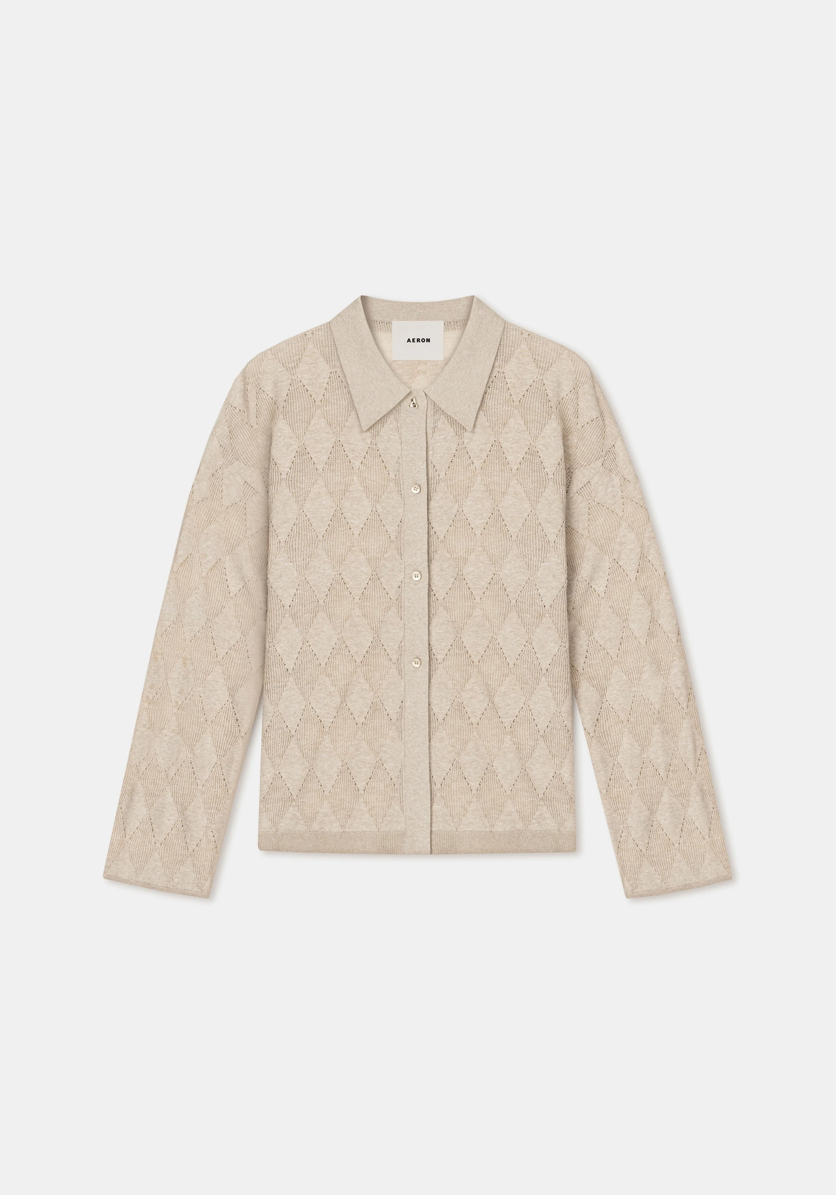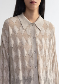 Our TAMARA cardigan shirt is made of a linen, cotton and CiCLO® recycled polyester blend. This piece has a delicate, loosely knitted structure that creates a semi-sheer look featuring a diamond pattern. It has a regular fit and small A-button. Size and Fit Fits true to size, take your normal size. The model is 180 cm and wears a size S. Fabric and Care 30% Linen 39% Cotton 17% CiCLO®Recycled Polyester 14% Nylon Hand wash at 30°C, Do not bleach, Do not tumble dry, Iron low temperature, Do not wring, Dry flat, Suitable for dry cleaning, Suitable for professional wet cleaning