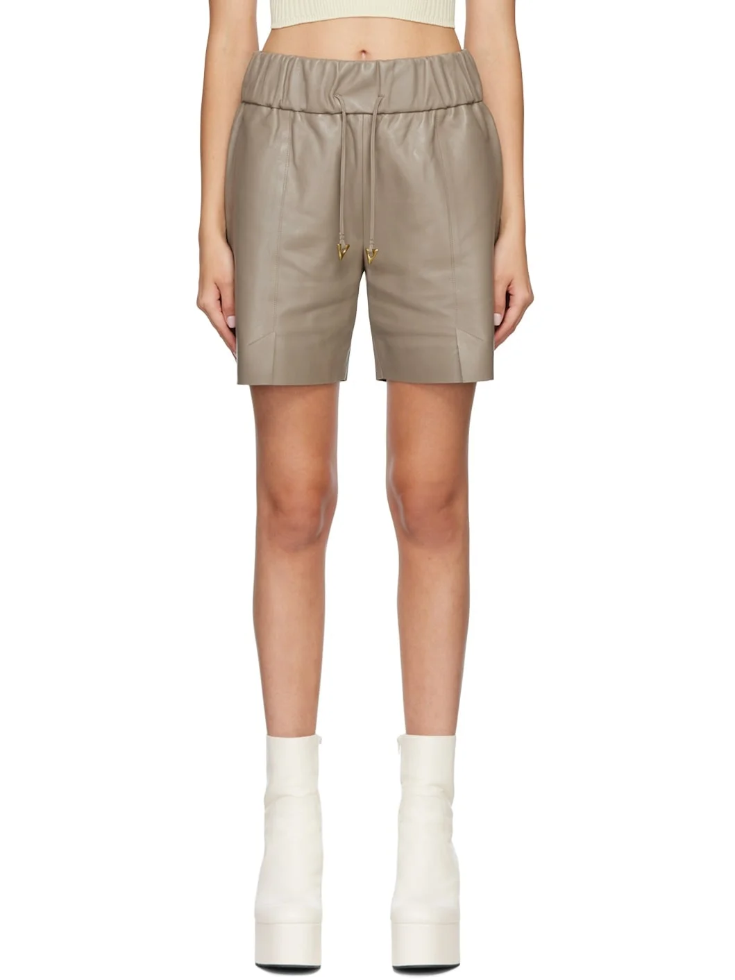 Grained lambskin shorts. · Drawstring at elasticized waistband · Single-pocket styling · Acetate-blend satin lining Supplier color: Fossil Body: 100% lambskin. Lining: 68% acetate, 32% polybutylene terephthalate. Made in Hungary 222343F088000