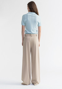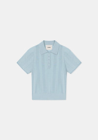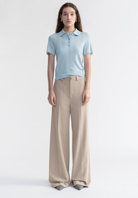 Our TOSCA short sleeved top is made of an extrafine merino wool blend. This piece has a regular fit and a slightly cropped silhouette, featuring a polo neck. The vertical knit and purl rows create a slightly textured effect on the body. Size and Fit Fits true to size, take your normal size. The model is 180 cm and wears a size S. Fabric and Care 75% Extrafine merino wool, 25% Lenzing lyocell Do not wash, Do not bleach, Do not tumble dry, Do not iron, Do not wring, Dry flat, Duitable for dry cleaning