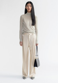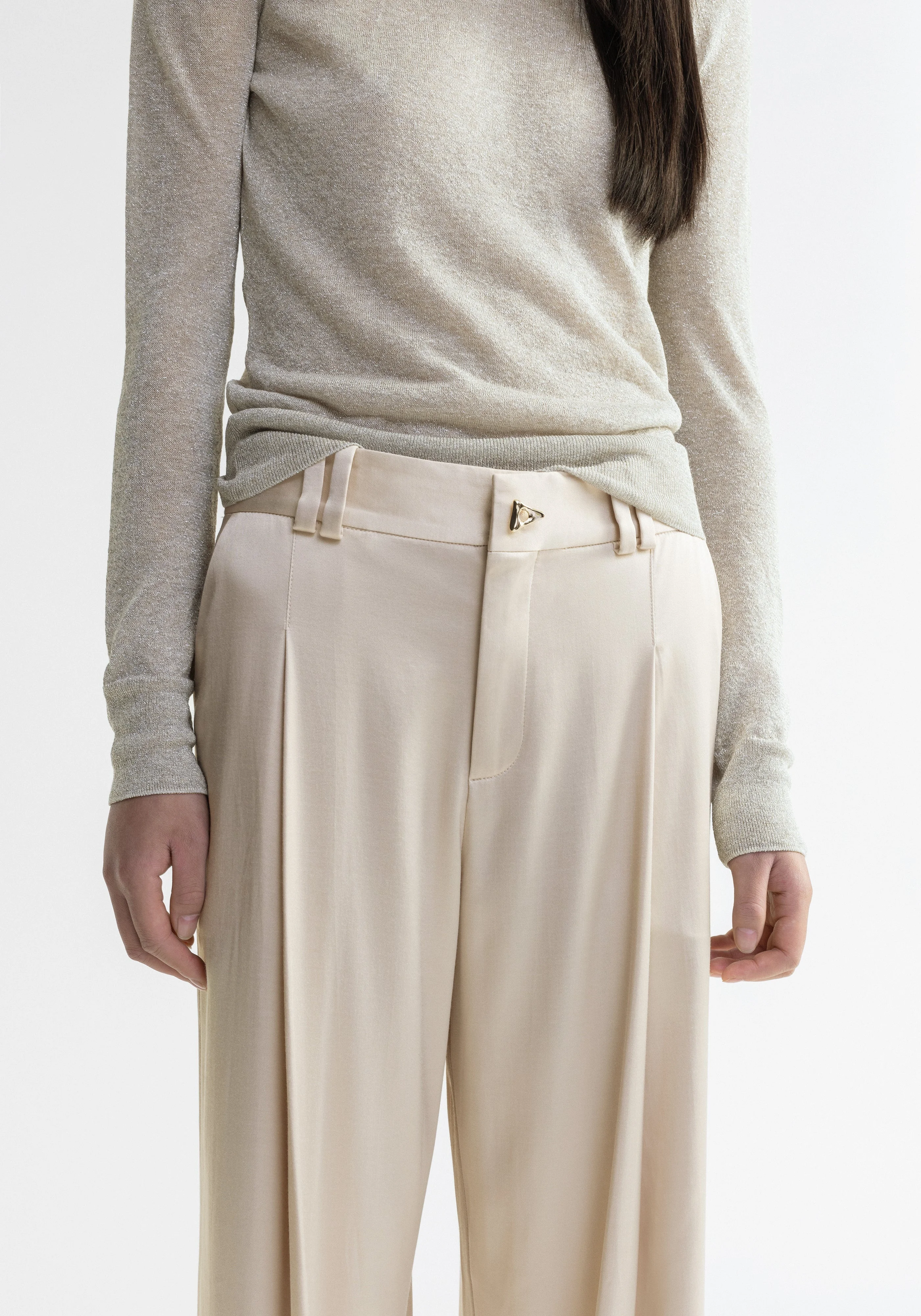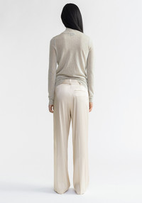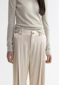 Our WELLEN satin wide-leg pants are made of a sustainable FSC-certified viscose blend. This elegant comfort piece has sharp pleats and side slant pockets. It is a versatile choice for sophisticated party looks. Size and Fit Fits true to size, take your normal size. The model is 180 cm and wears a size 36. Fabric and Care 44% FSC Viscose 52% Rayon 4% Spandex Do not wash, Do not bleach, Do not tumble dry, Iron low temperature, Suitable for dry cleaning, Suitable for professional wet cleaning