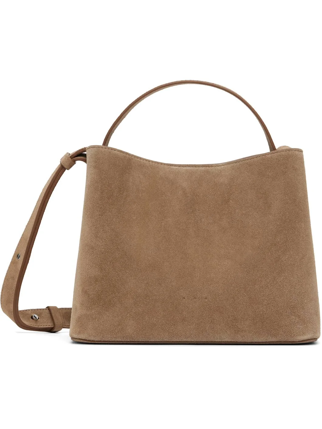 Calfskin suede shoulder bag. · Burnished edges throughout · Fixed carry handle · Adjustable shoulder strap · Logo graphic embossed at face · Magnetic fastening at open throat · Patch pocket at faux-suede interior · H7.5" x W9.5" x D4.5" Supplier color: Suede date Calfskin. Made in Spain 261239F048028