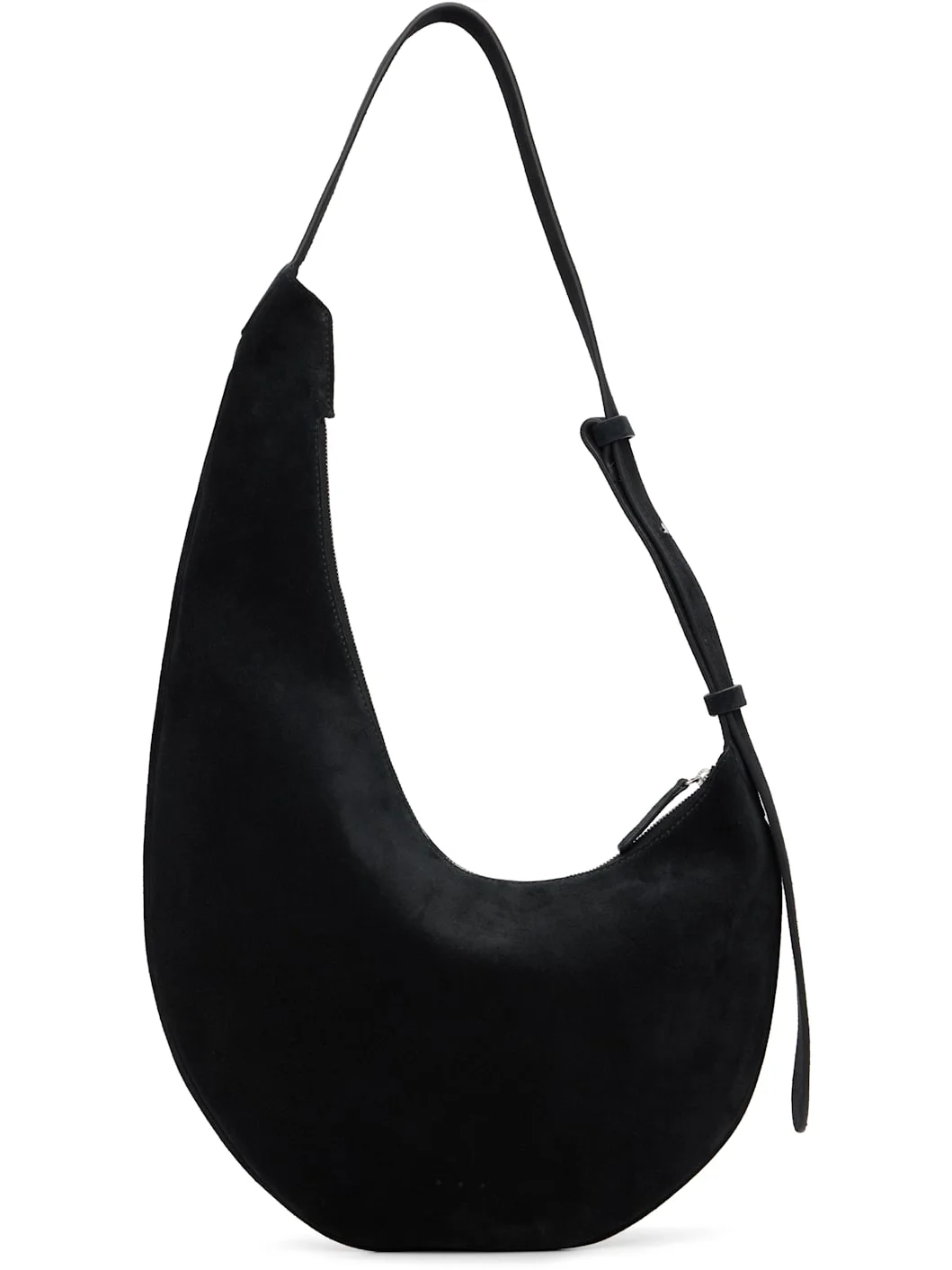 Calfskin suede shoulder bag. · Adjustable shoulder strap · Logo embossed at face · Zip closure · Patch pocket at grosgrain interior · H8.5" x W13" x D1.25" Supplier color: Suede black Body: 100% calfskin. Lining: 100% polyester. Made in Spain 261239F048024