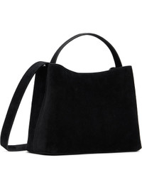 Calfskin suede shoulder bag. · Burnished edges throughout · Fixed carry handle · Adjustable shoulder strap · Logo graphic embossed at face · Magnetic fastening at open throat · Patch pocket at faux-suede interior · H7.5" x W9.5" x D4.5" Supplier color: Black Calfskin. Made in Spain 261239F048029