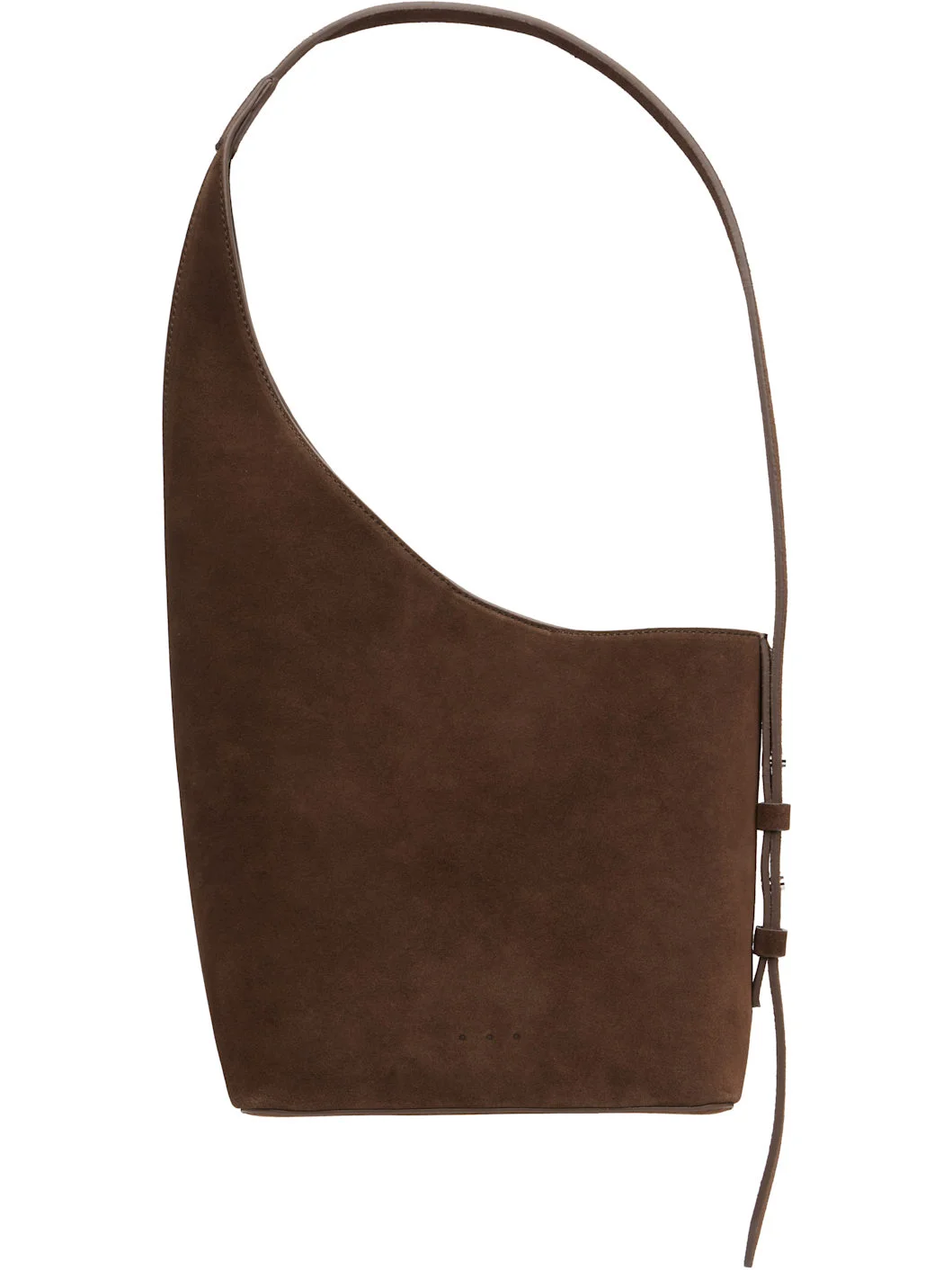 Calfskin suede shoulder bag. · Adjustable shoulder strap · Logo embossed at face · Magnetic closure · Patch pocket at interior · Faux-suede lining · H9" x W10" x D5" Supplier color: Suede cocoa Calfskin. Made in Spain 261239F048032