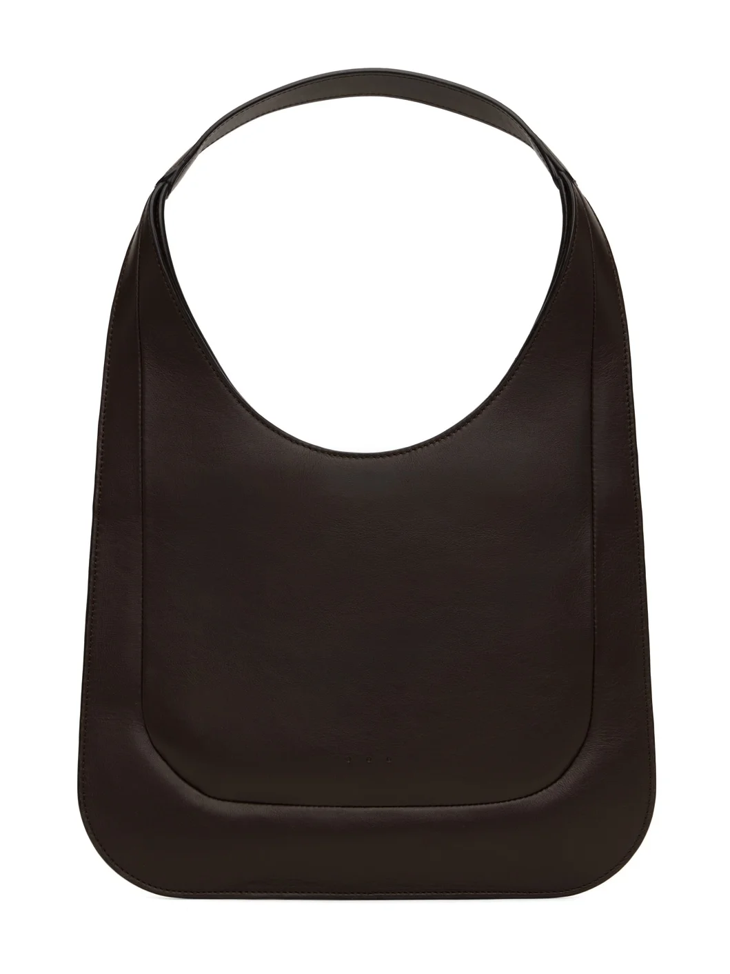 Buffed calfskin shoulder bag in brown. · Integrated shoulder strap · Logo embossed at face · Magnetic closure · Patch pocket at interior · Faille lining · H9.25" x W12" · Total height: H17" Supplier color: Dark coffee