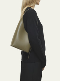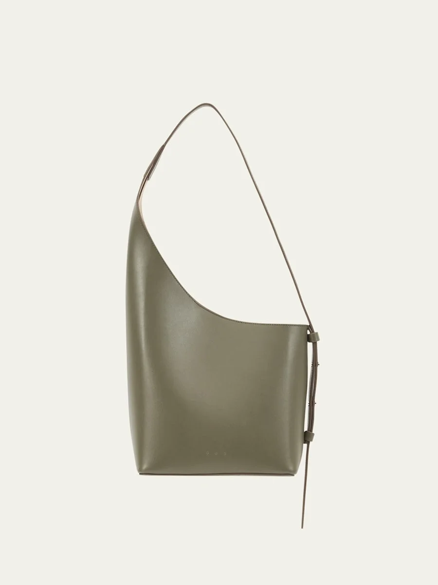 Aesther Ekme "Demi Lune" asymmetric bucket bag in smooth calfskin leather Adjustable shoulder strap, 8.7" drop Open top Interior, one slip pocket Eco suede lining Approx. 16.5"H x 7.7"W x 4.5"D Item Weight (Lbs.): 1.1 Made in Spain Online Inquiries: BGS21_V6LLL| Store Inquiries: #5045193