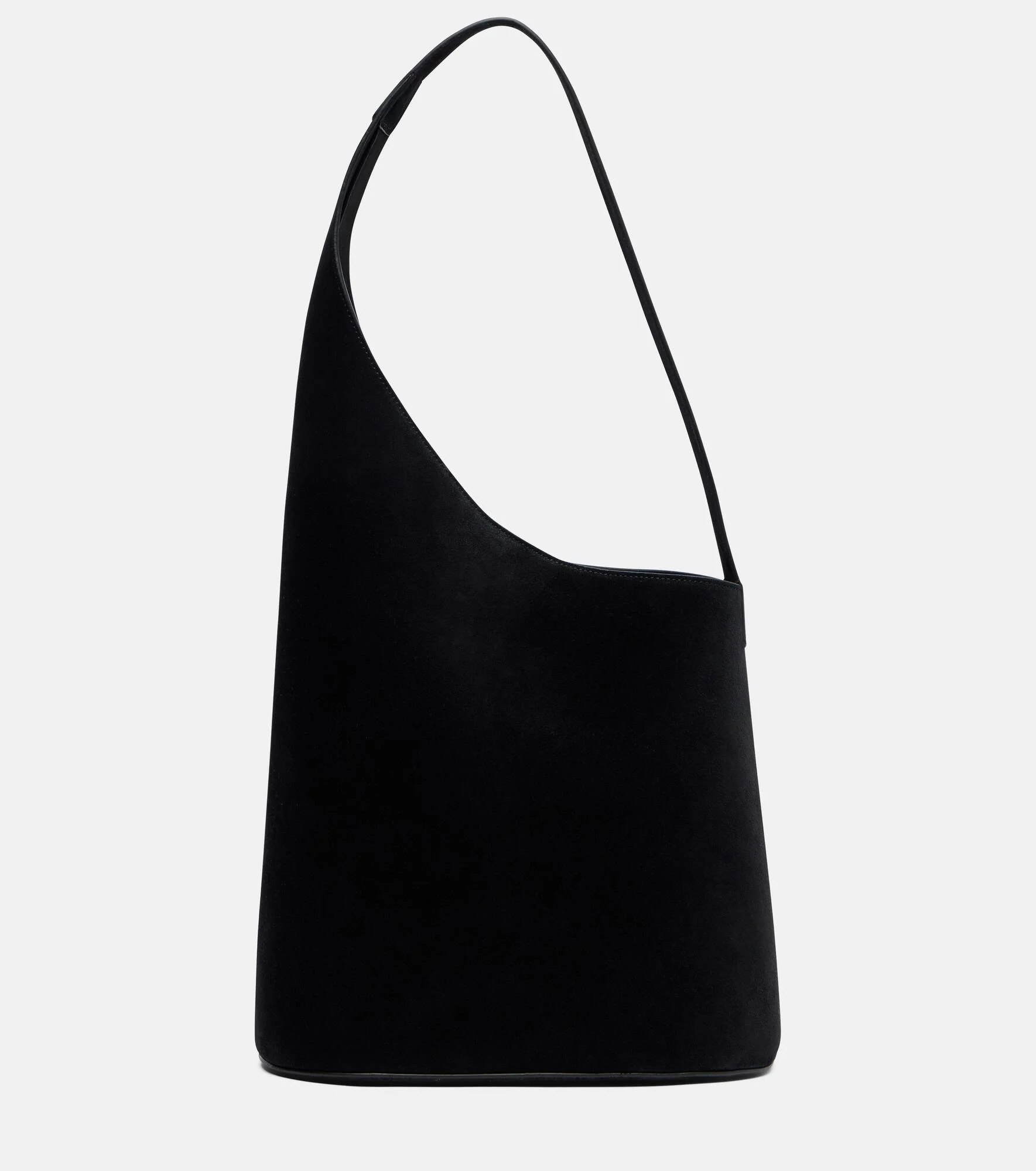 Sculptural silhouettes and the finest materials shape Aesther Ekme's vision of refined minimalism. Characterized by an asymmetrical shape, the Demi Lune tote bag is crafted from soft suede and features an internal pocket. Product Details - Material: calf leather (suede) - Lining: fabric - Made in Spain - Designer color name: 101 Spazzolato Black - Item color: black - Internal details: internal slot pocket - Closure: magnetic fastening - Shoulder strap - Includes: dust bag - Item number: P01039115 Size & Fit - Height 27cm-10.5" - Width 29cm-11.5" - Depth 14cm-5.5" - Length of handles 45cm-17.5"