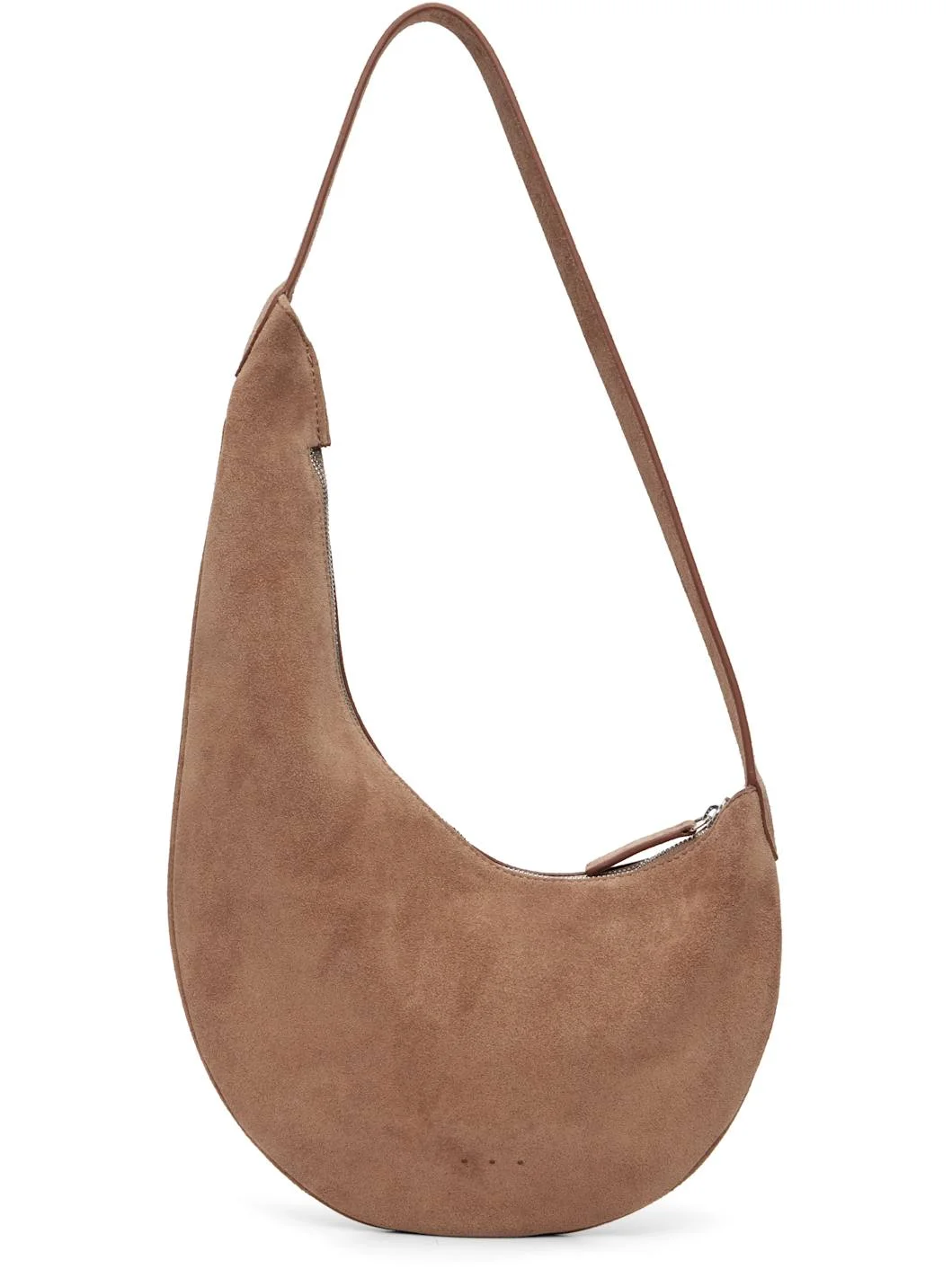 Calfskin suede shoulder bag. · Fixed shoulder strap · Logo embossed at face · Zip closure · Patch pocket at interior · Grosgrain lining · H7" x W10.25" x D1.25" Supplier color: Suede date Body: 100% calfskin. Lining: 100% polyester. Made in Spain 261239F048036