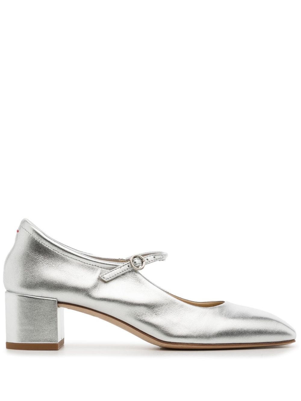 Aline 45mm metallic leather pumps A statement take on classic Mary Jane styles, Aeyde's Aline pumps are crafted from supple metallic leather. They’re set on a 45mm block heel and fasten with a signature buckle. Highlights - Silver-tone - Nappa leather - Metallic finish - Round toe - Buckle-fastening ankle strap - Branded leather insole - Mid block heel Made in Italy Composition Lining: Lamb Skin 100% Sole: Nappa Leather 100% Outer: Nappa Leather 100% SIZE & FIT Measurement HEEL 1.96 in(5 cm) Sole height 0.19 in(0.5 cm)