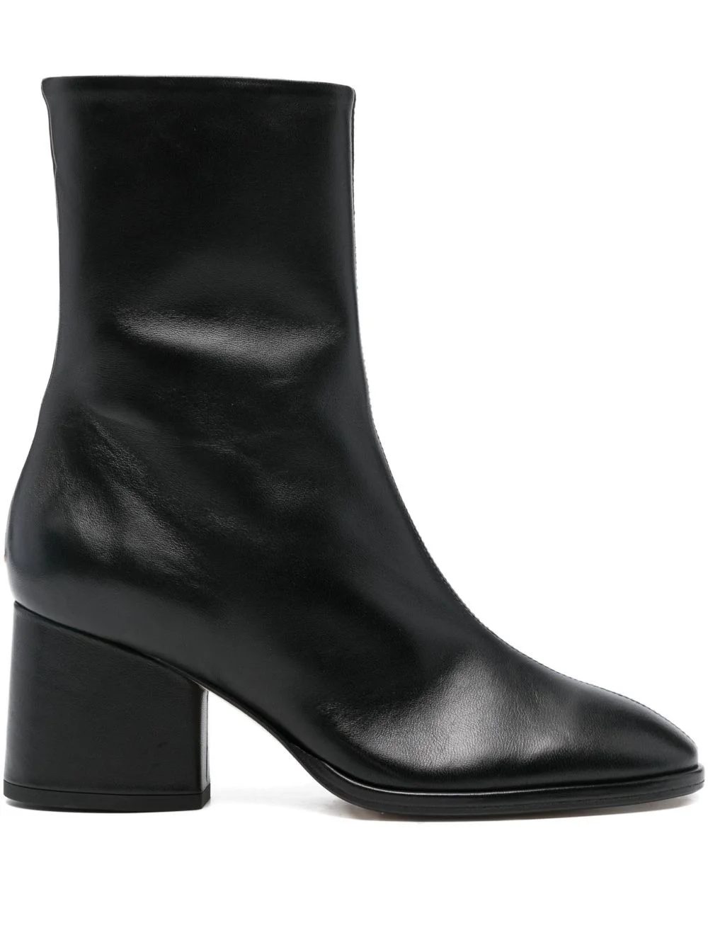 65mm leather ankle boots Highlights - Black - Leather - Block heel - Rear zip fastening - Almond toe - Pull-on tab Imported Composition Sole: Calf Leather 100%, Rubber 100% Outer: Calf Leather 100% Lining: Calf Leather 100% SIZE & FIT Measurement HEEL 2.55 in(6.5 cm)
