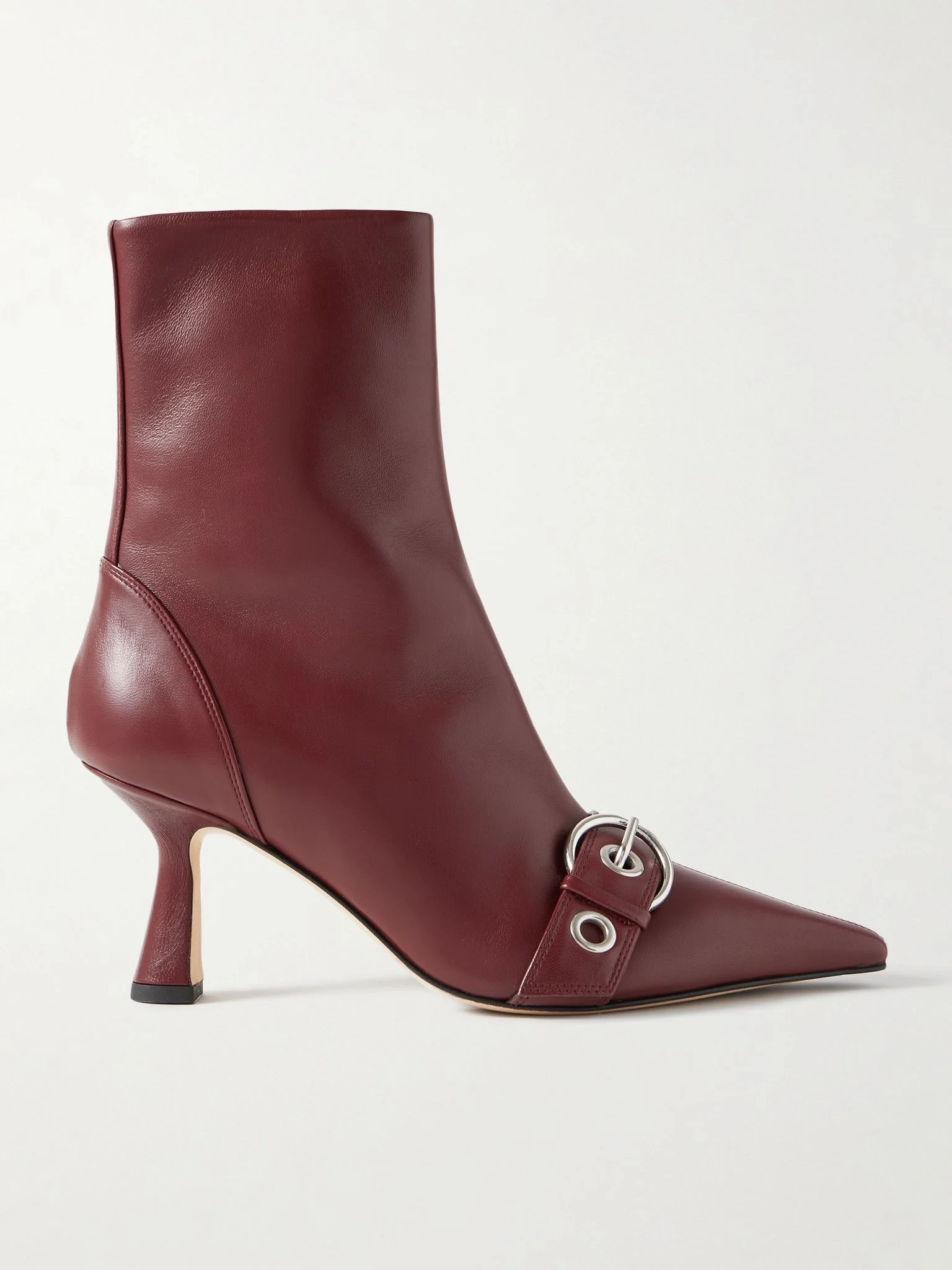 Aeyde's 'Halima' ankle boots are inspired by styles from the early 2000s. They've been made in Italy from smooth burgundy leather and have silver-tone buckles across the pointed toes. The curved heels offer subtle lift. Lower-Impact Materials. This product is made using at least 50% lower-impact materials or ingredients. Find out more about our NET SUSTAIN criteria here. Size & Fit - Fits true to size, take your normal size - Narrow at the toe - Italian sizing Details & Care - Heel measures approximately 35mm/ 1.5 inches - Burgundy leather (Goat) - Zip fastening along sides - Designer color: Port - By purchasing this product, you are supporting responsible leather manufacturing through Leather Working Group.