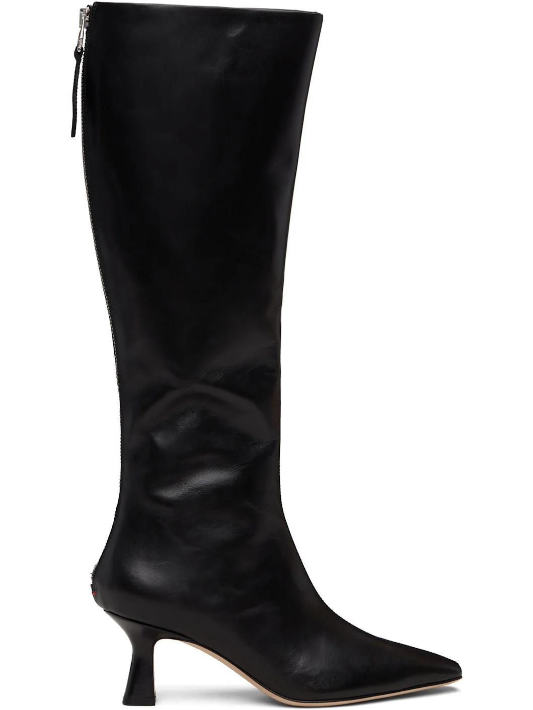 Knee-high buffed calfskin boots. · Pointed square toe · Central seam at vamp · Zip closure and red stitch at heel · Buffed leather lining · Stacked leather heel with rubber injection · Leather sole · Heel: H2.25" Supplier color: Black Upper: calfskin. Sole: leather. Made in Italy 252454F115006