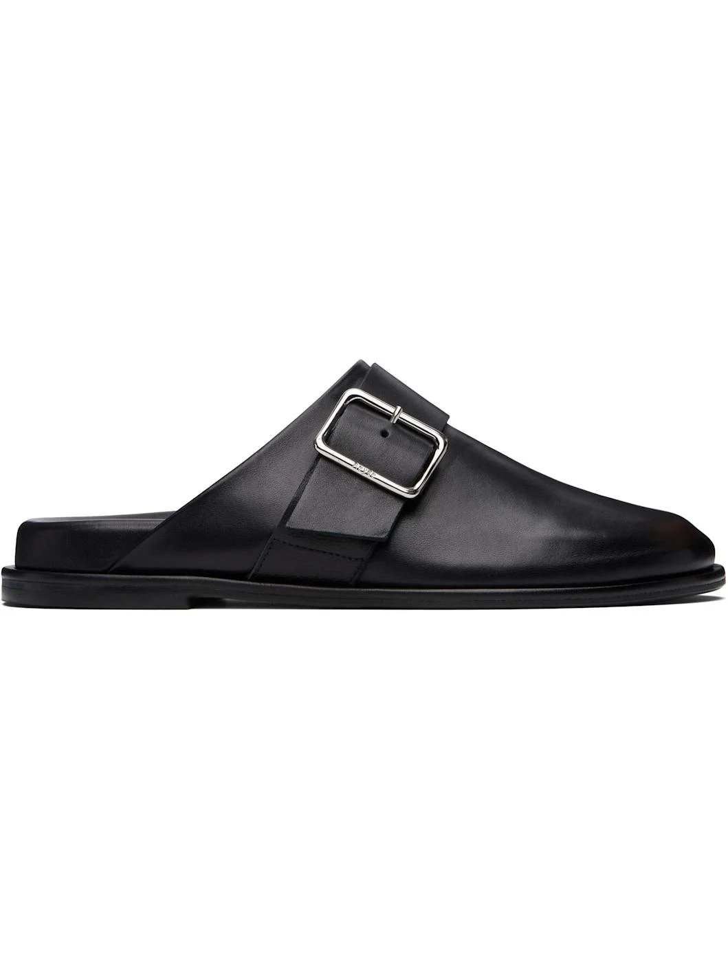 Buffed nappa leather slip-on loafers in black. · Pin-buckle strap at vamp · Logo embossed at padded lambskin footbed · Stacked leather heel with rubber injection · Nubuck sole · Logo-engraved silver-tone hardware Supplier color: Black nappa Upper: leather. Sole: leather, rubber. Made in Italy 251454F121013