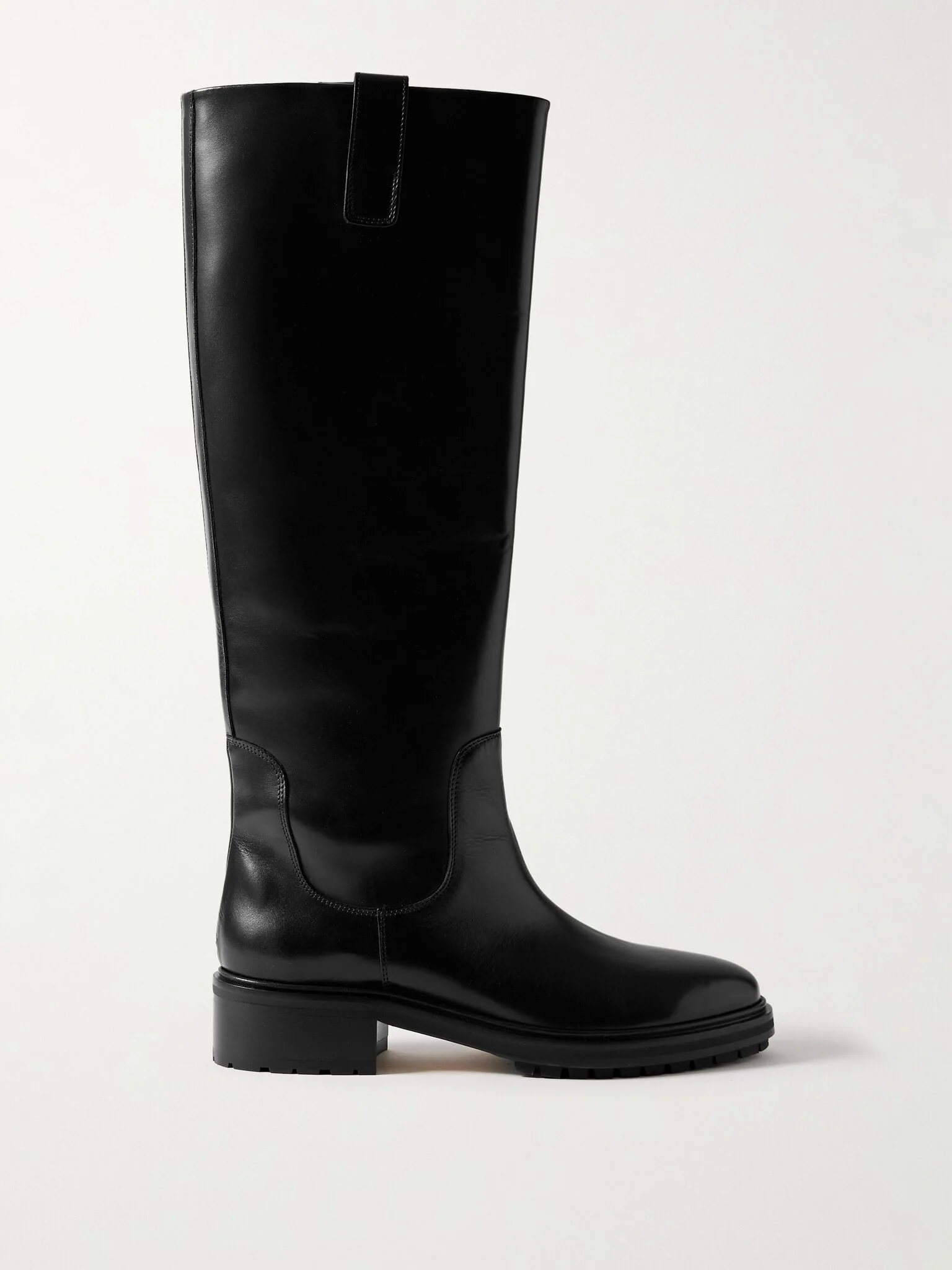 aeyde's footwear is crafted in the label's family-owned atelier. Made from smooth leather, these 'Henry' boots take cues from riding styles, with a knee-high silhouette, comfortable low heel and round toe. The pull tabs help to get them on with ease. Size & Fit - Fits true to size, take your normal size - Only available in full sizes, go up to the nearest whole size if you take a half size - Italian sizing Details & Care - Heel measures approximately 45mm/ 2 inches - Black leather (Calf) - Pull on