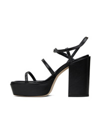 Grained nappa leather heeled sandals in black. · Open square toe · Straps at vamp · Pin-buckle ankle strap · Logo embossed at padded lambskin footbed · Covered platform midsole and block heel · Suede sole · Platform: H1.5" · Heel: H4.25" Supplier color: Black Leather. Made in Italy 241454F125011