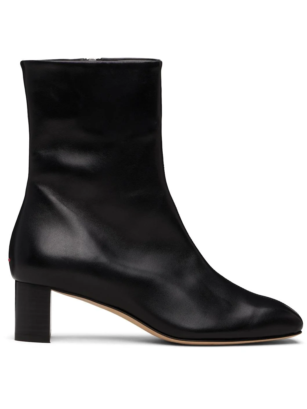 Ankle-high buffed nappa leather boots. · Square toe · Central seam at vamp · Zip closure at inner side · Red stitch at heel · Buffed leather lining · Stacked leather block heel with rubber injection · Leather sole · Heel: H1.75" Supplier color: Black Leather. Made in Italy 252454F113009