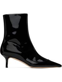 Handcrafted ankle-high LWG-certified patent calfskin boots in black. · Pointed leather cap toe · Zip closure at inner side · Grained lambskin lining · Red stitch at heel · Covered kitten heel with rubber injection · Nubuck sole with rubber injection · Heel: H2" Supplier color: Black patent Upper: calfskin. Sole: leather, rubber. Made in Italy 251454F113000