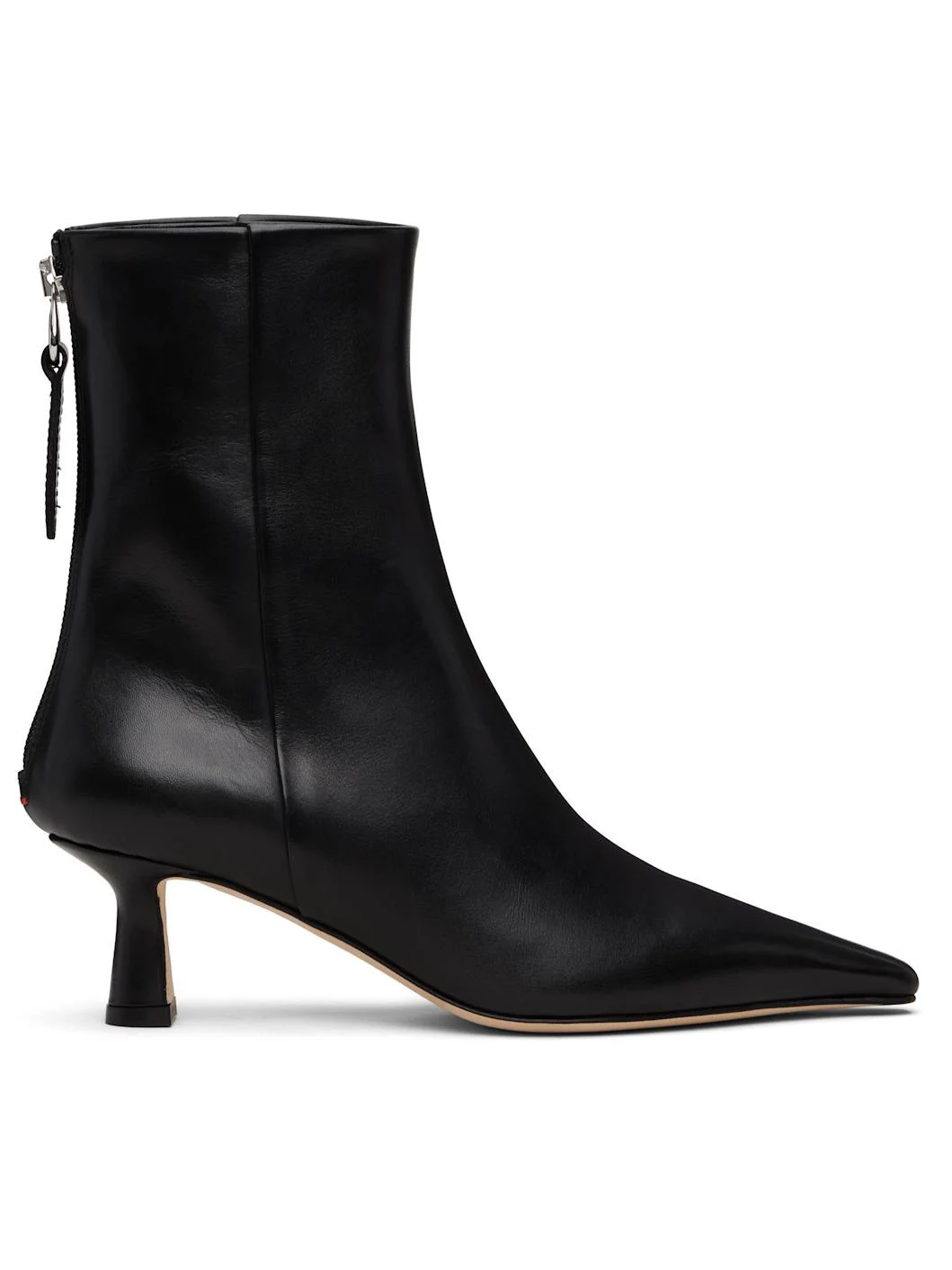 Ankle-high buffed calfskin boots. · Pointed toe · Zip closure and red stitch at heel · Buffed leather lining · Covered kitten heel · Leather sole with rubber injections · Heel: H2" Supplier color: Black Upper: calfskin. Sole: leather, rubber. Made in Italy 252454F113015