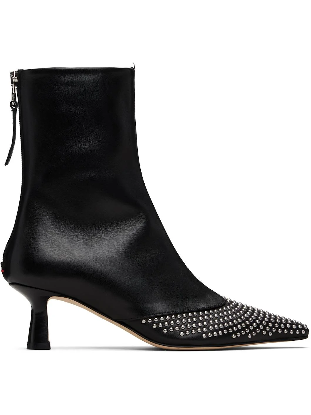 Ankle-high buffed nappa leather boots. · Studded detailing at pointed toe and vamp · Zip closure at heel · Red stitch at heel · Grained lambskin lining · Kitten heel with rubber injection · Nubuck sole with rubber injection · Heel: H2.25" Supplier color: Black nappa Upper: leather. Sole: leather, rubber. Made in Italy 261454F113004