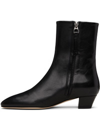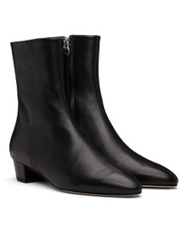 Ankle-high buffed calfskin boots. · Almond toe · Zip closure at inner side · Red stitch at heel · Buffed leather lining · Covered block heel with rubber injection · Leather sole · Heel: H1.25" Supplier color: Black Upper: calfskin. Sole: leather. Made in Italy 252454F113011