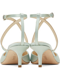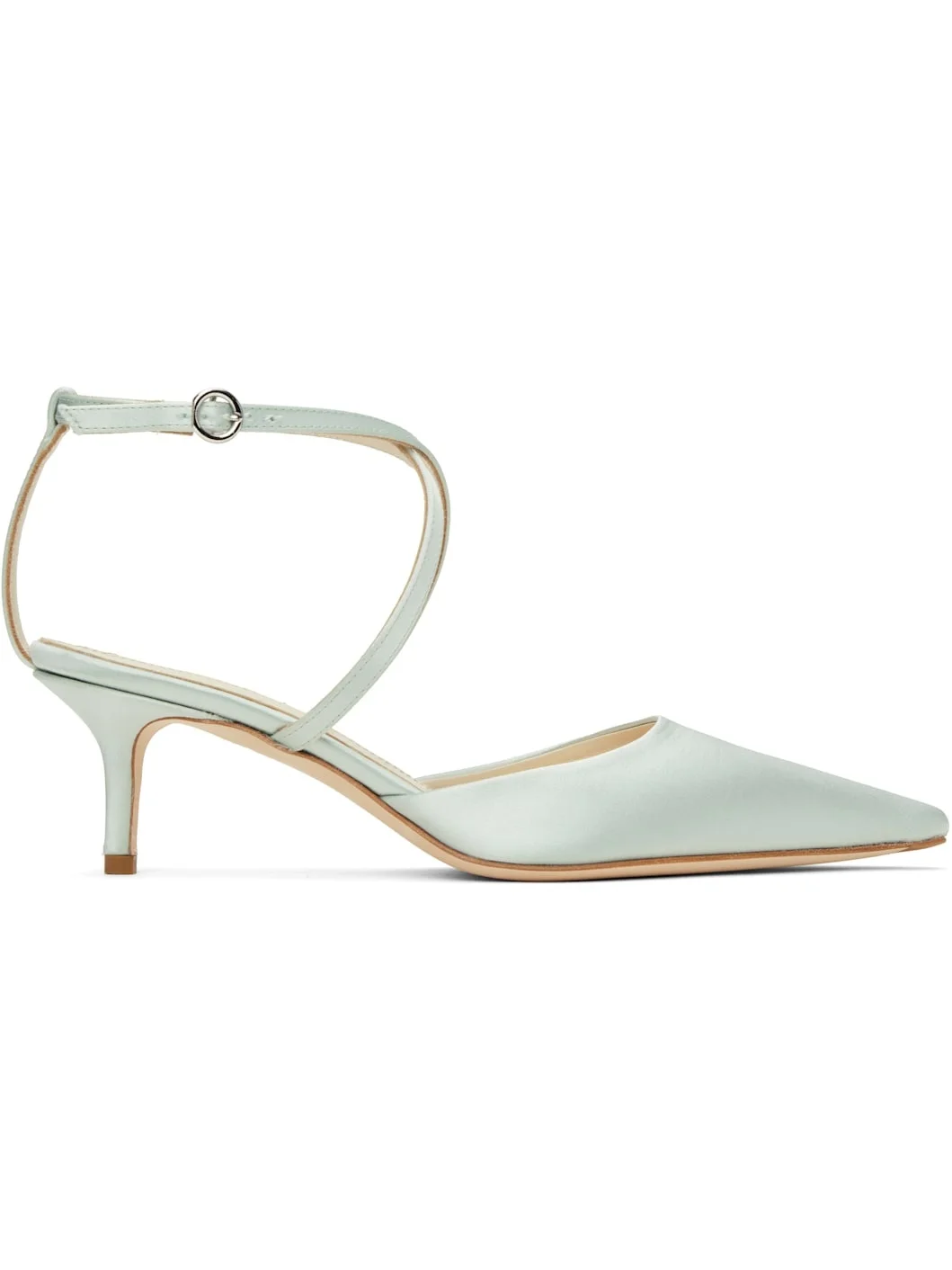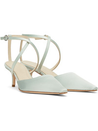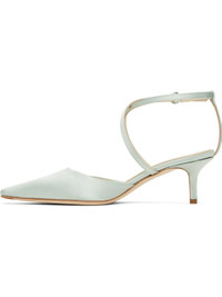 Satin heels in blue. · Pointed toe · Crisscrossing pin-buckle ankle strap · Grained leather lining · Covered kitten heel with rubber injection · Suede sole with rubber injection · Heel: H2" Part of the Satin capsule. Supplier color: Cloud Upper: textile, leather. Sole: leather, rubber. Made in Italy 251454F122061