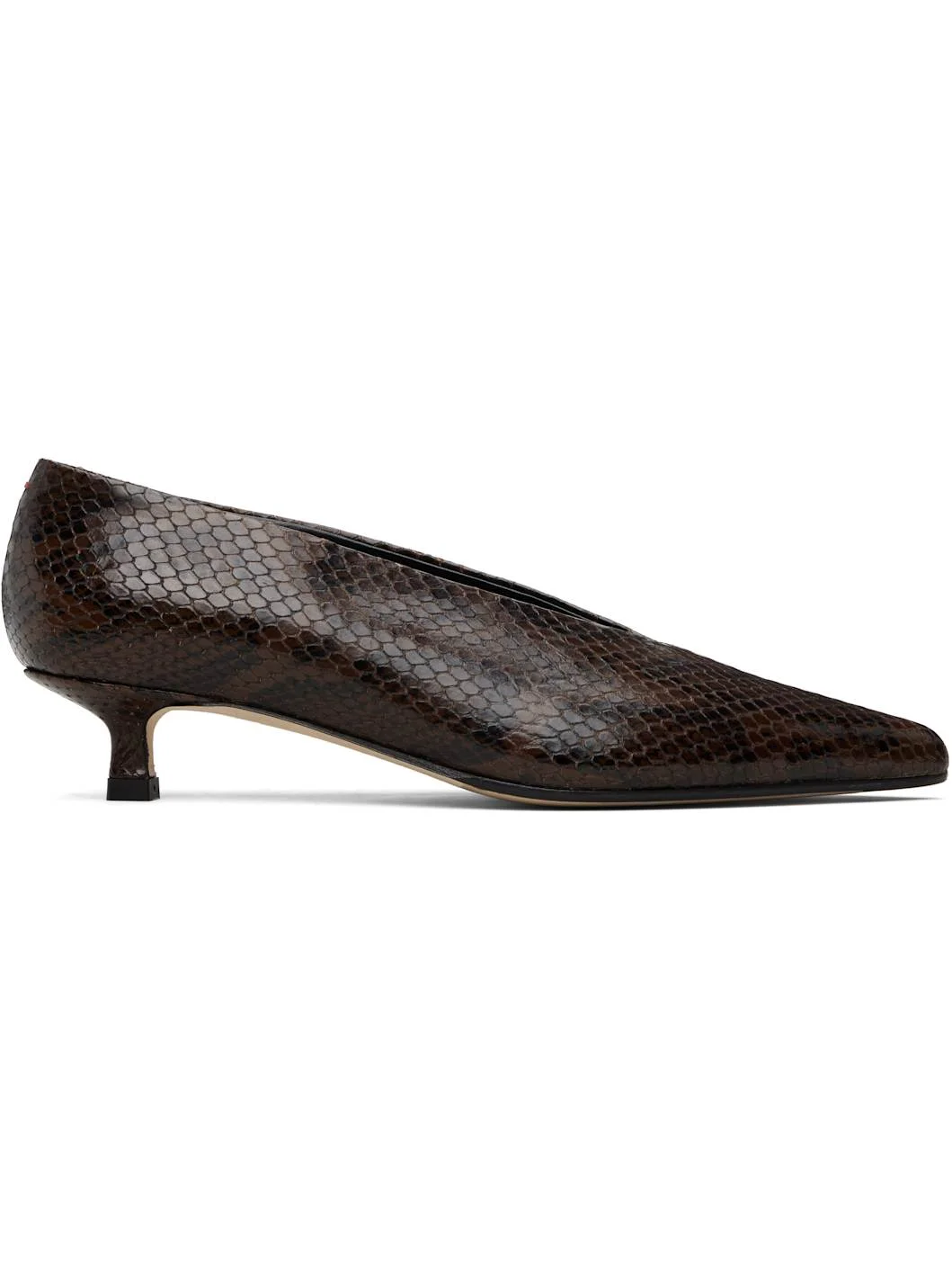 Snake-embossed calfskin heels. · Pointed toe · Buffed lambskin lining · Covered kitten heel with rubber injection · Leather sole with rubber injection · Heel: H1.25" Supplier color: Moka snake Upper: calfskin. Sole: leather, rubber. Made in Italy 261454F122027
