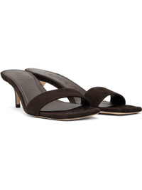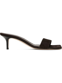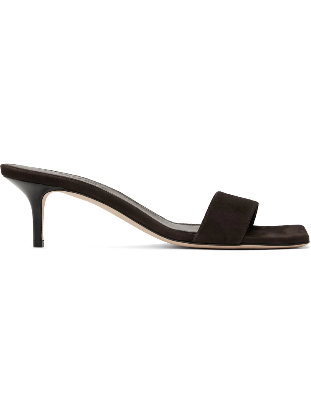 Kidskin suede mules in brown. · Open square toe · Strap at vamp · Covered kitten heel with rubber injection · Suede sole · Heel: H2.5" Supplier color: Moka Upper: kidskin. Sole: leather, rubber. Made in Italy 251454F125037