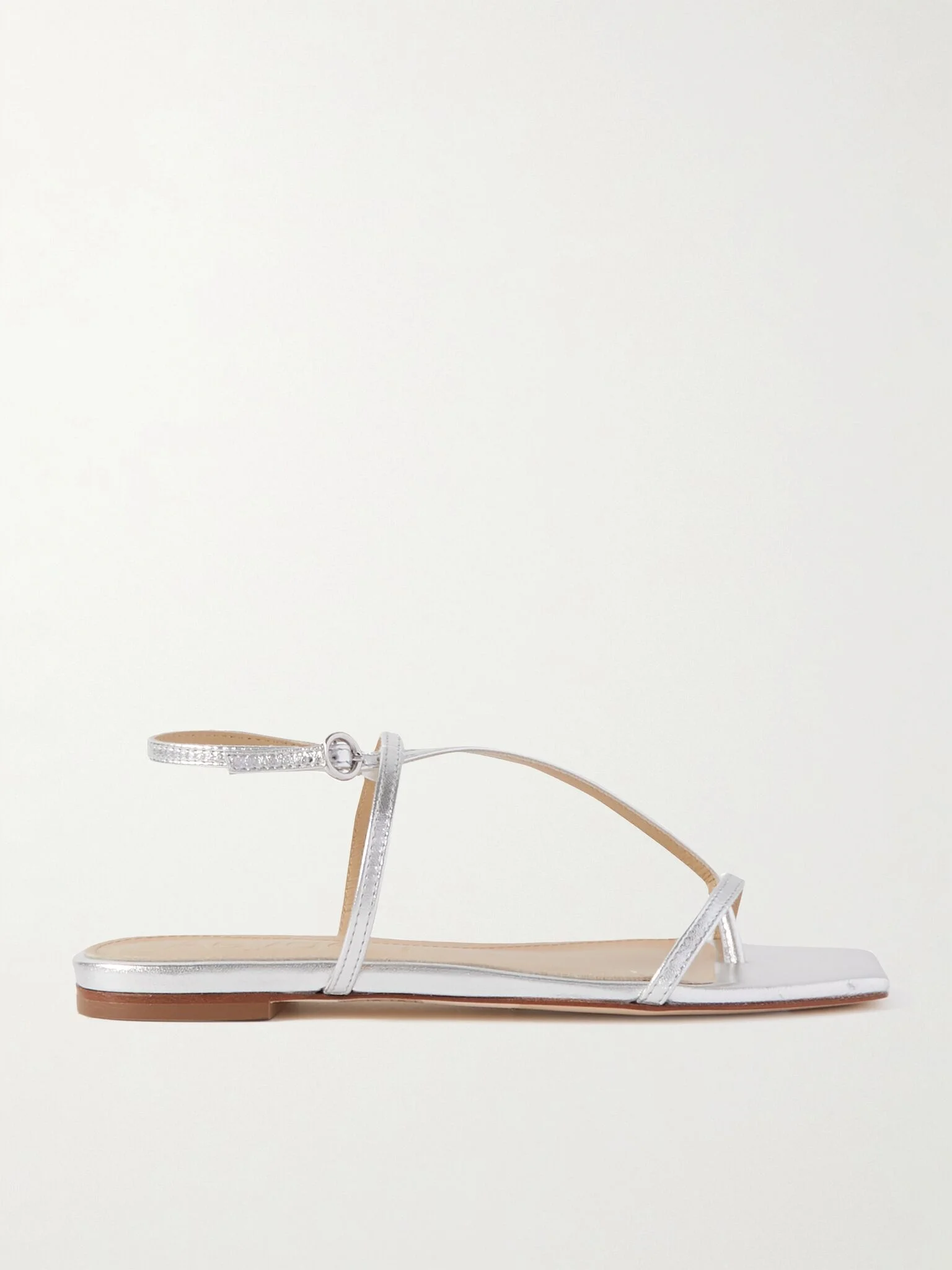 aeyde’s ‘Ella’ sandals are timeless and glamorous at the same time thanks to their metallic sheen. They're crafted from silver leather and have slim straps to create a barely-there feel. Wear yours with anything from wide-leg pants to pleated skirts. Size & Fit - Fits true to size, take your normal size - Italian sizing Details & Care - Silver metallic leather (Goat) - Buckle-fastening ankle strap