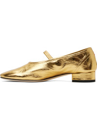 Crackled laminated calfskin ballerina flats in gold tone. · Square toe · Elasticized strap at vamp · Red stitch at heel collar · Grained leather lining · Covered block heel with rubber injection · Suede sole · Heel: H1" Supplier color: Gold Upper: calfskin. Sole: leather, rubber. Made in Italy 251454F118063