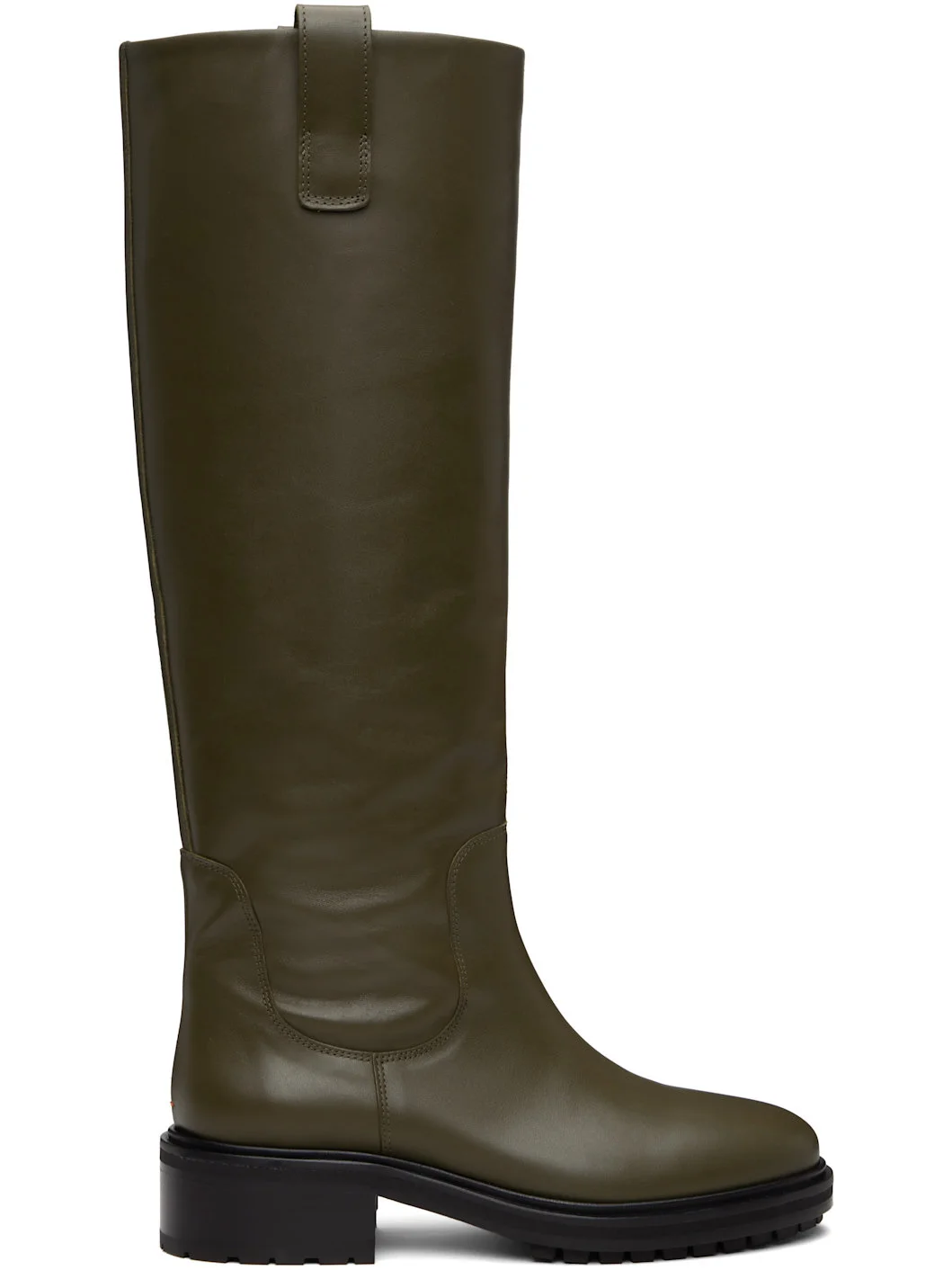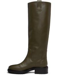 Knee-high buffed calfskin boots. · Pull-loops at collar · Red stitch at heel counter · Buffed lambskin lining · Stacked leather and rubber midsole and block heel · Treaded rubber sole · Heel: H1.5" Supplier color: Olive Upper: calfskin. Sole: leather, rubber. Made in Italy 252454F115013
