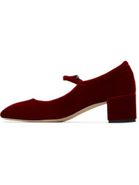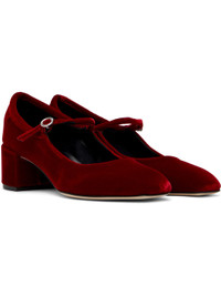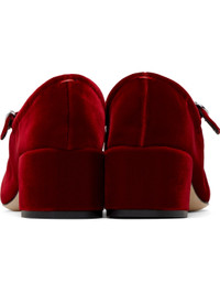 Handcrafted velvet Mary-Jane-style heels in red. · Square toe · Pin-buckle strap at vamp · Red stitch at heel · Logo embossed at padded lambskin insole · Buffed lambskin lining · Covered block heel with rubber injection · Nubuck sole · Heel: H1.75" Supplier color: Red velvet Upper: textile. Sole: leather, rubber. Made in Italy 251454F122000