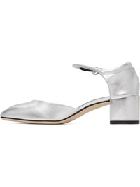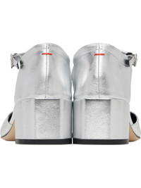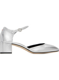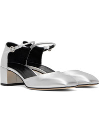 Handcrafted and LWG-certified nappa leather Mary Jane-style heels in metallic silver tone. · Square toe · Pin-buckle ankle strap · Red stitch at heel · Logo embossed at padded lambskin footbed · Lambskin suede lining · Covered block heel with rubber injection · Suede sole · Heel: H2" Supplier color: Silver nappa Upper: leather. Sole: leather, rubber. Made in Italy 251454F122002