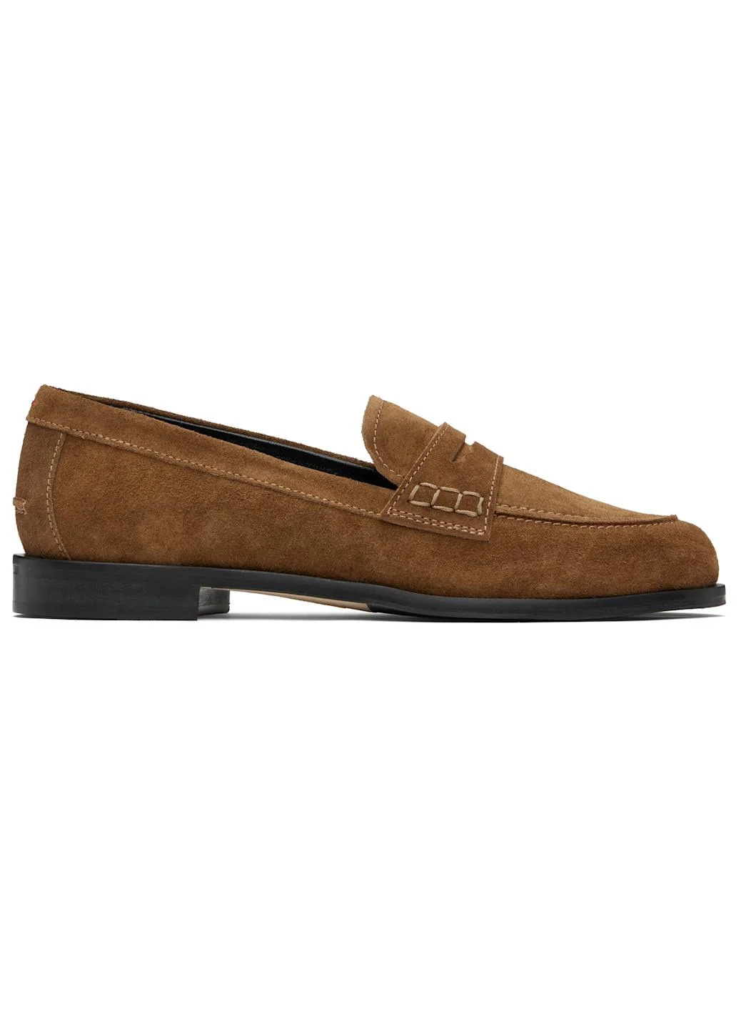 Suede loafers. · Strap with cutout at vamp · Red stitch at heel · Pinched seam at heel counter · Stacked leather block heel · Nubuck sole with rubber injections Supplier color: Tobacco Upper: leather. Sole: leather, rubber. Made in Italy 252454F121004
