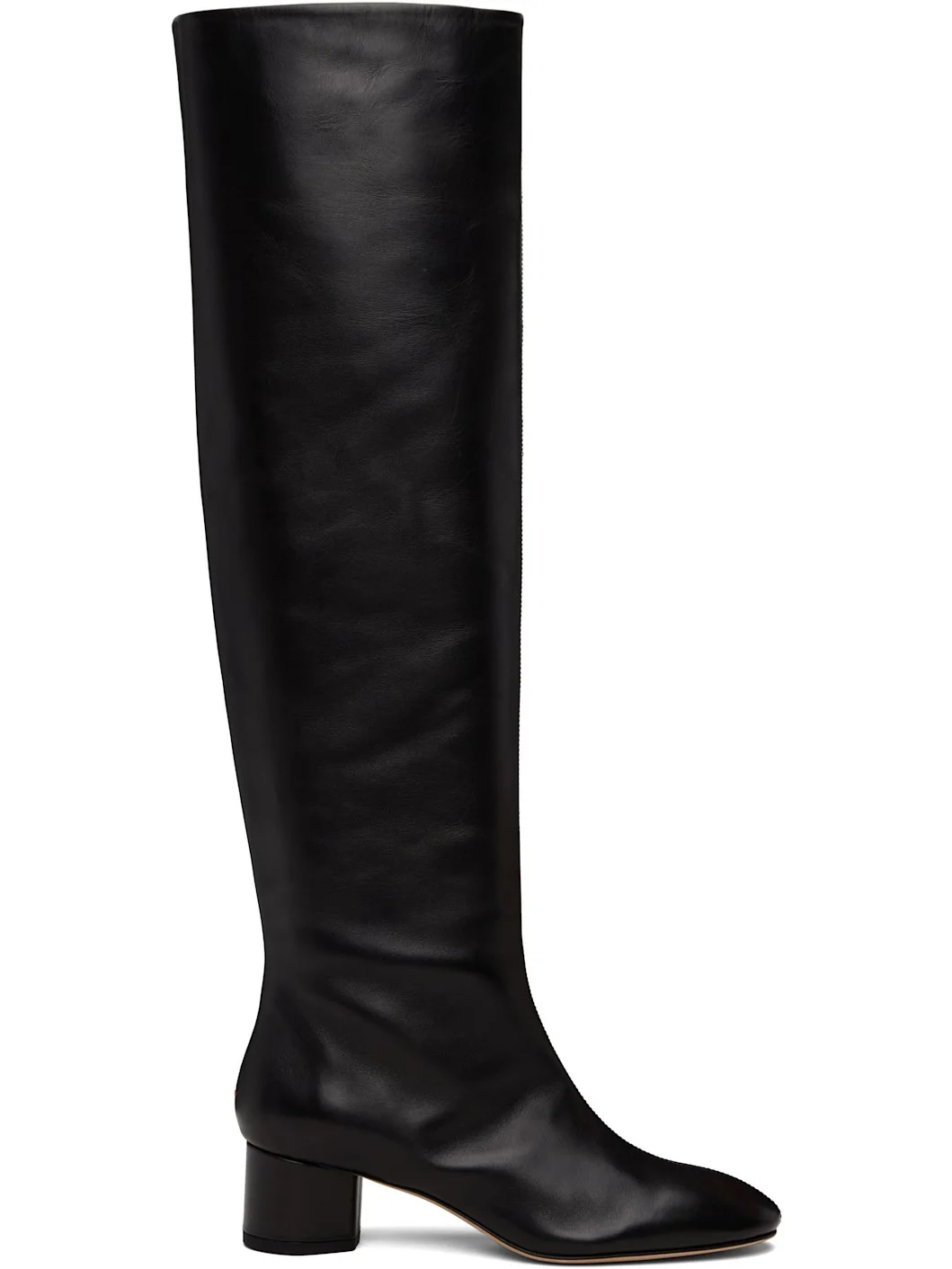 Over-the-knee buffed calfskin boots. · Central seam at vamp · Red stitch at heel · Buffed lambskin lining · Cylindrical heel with rubber injection · Leather sole · Heel: H1.75" Supplier color: Black calf Upper: calfskin. Sole: leather. Made in Italy 252454F115015