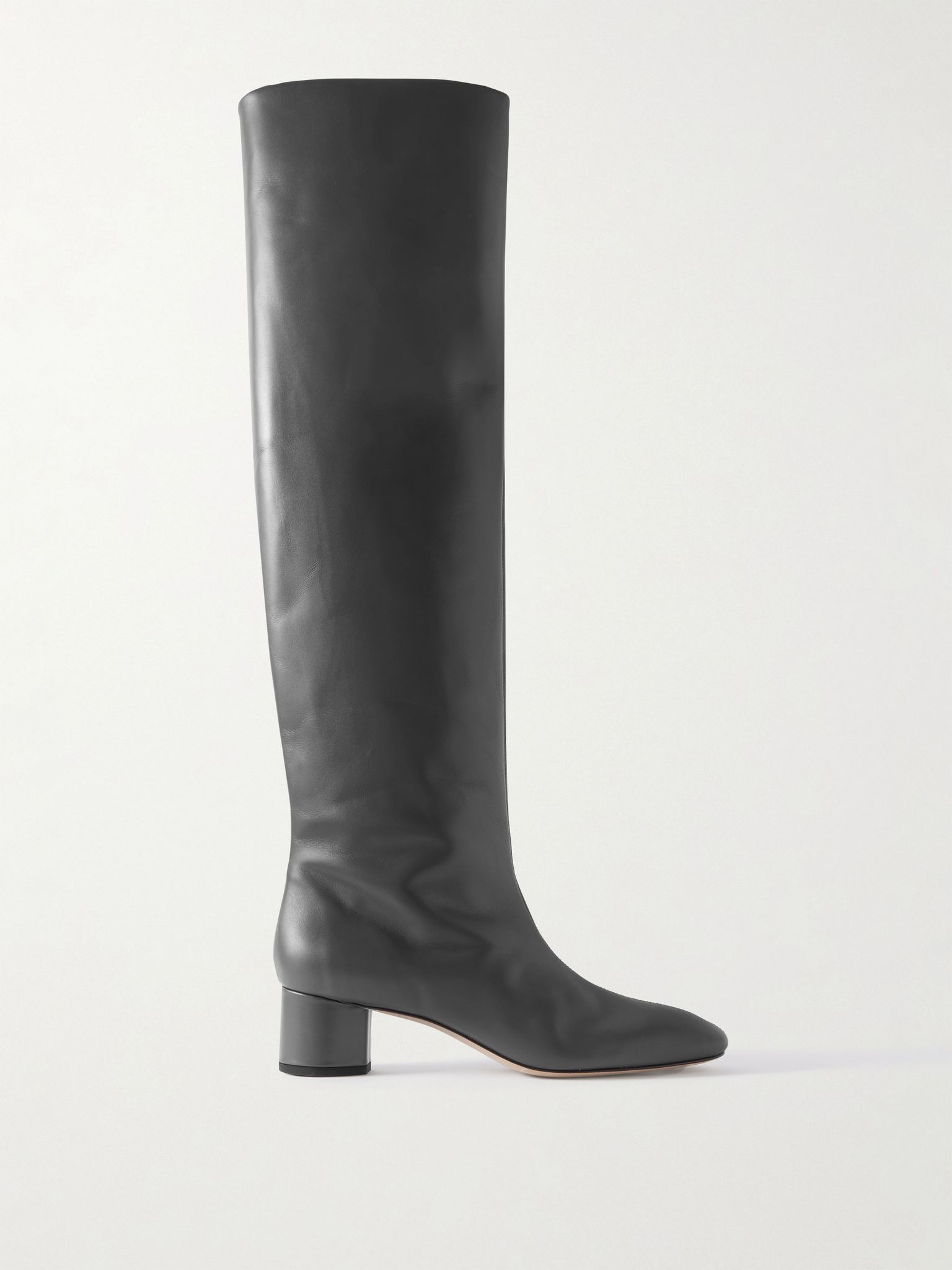 The red stitch on each of the heels of Aeyde's 'Willa' over-the-knee boots is a stamp of the brand's fine craftsmanship and attention to detail. They're made from dark-gray leather with rounded toes and 45mm block heels that offer just enough lift. Lower-Impact Materials. This product is made using at least 50% lower-impact materials or ingredients. Find out more about our NET SUSTAIN criteria here. Size & Fit - Fits true to size, take your normal size - Only available in full sizes, go down to the nearest whole size if you take a half size - Italian sizing Details & Care - Heel measures approximately 45mm/ 2 inches - Dark-gray leather (Calf) - Pull on - By purchasing this product, you are supporting responsible leather manufacturing through Leather Working Group.