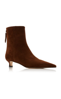 Founded in 2015 by founder and creative director Luisa Dames, Berlin-based footwear and accessories brand envisions a more understated version of luxury and sets out to democratize modern design and enduring quality. Drawing from German concepts of modernity, Aeyde has developed a signature aesthetic defined by classic shapes and modern details—marrying form and function, the past and the present, the masculine and the feminine. The 'Zoe' ankle boots have a sleek, pointed toe and buttery suede body set atop a modest kitten heel for ultra-walkability. PRODUCT DETAILS - Heel measures approximately 35mm / 1.3" - Zip fastening - Composition: cow suede - Made in Italy