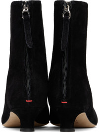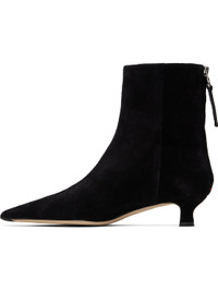 Ankle-high suede boots. · Pointed toe · Zip closure at back · Red stitch at heel counter · Lambskin lining · Covered kitten heel · Nubuck sole with rubber injections · Heel: H1.5" Supplier color: Black Upper: leather. Sole: leather, rubber. Made in Italy 252454F113027