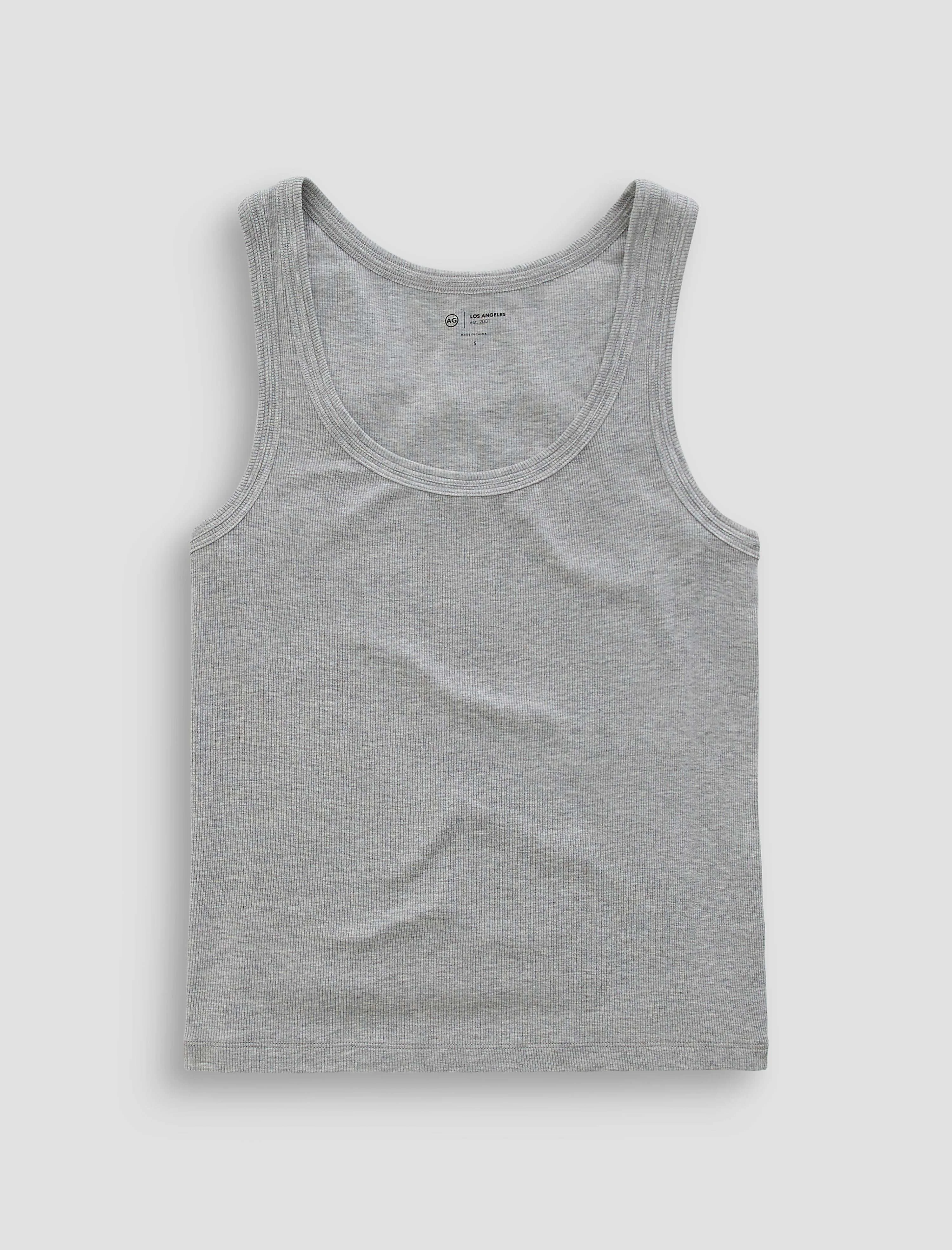 Essentials Rib Knit Ashley is the essential ribbed knit tank crafted from Flex 2X2 Rib knit. Balancing comfort with a polished aesthetic, this scoop neck tank is a versatile foundation piece with an incredibly soft handfeel and stretchy vertical ribbing for a form-fitting yet flexible silhouette. The ultimate anchor, this tank drapes nicely and can be styled with denim for a minimalist look or layered to add dimension to any outfit. Designed in a classic, slightly speckled grey color, Heather Grey. DETAILS & FIT Model is wearing size S. - Body Length: 23" - Chest Width: 28 1/2" FABRIC & CARE Flex 2X2 Rib, 75% Lyocell, 23% Polyester, 4% Spandex/Elastane