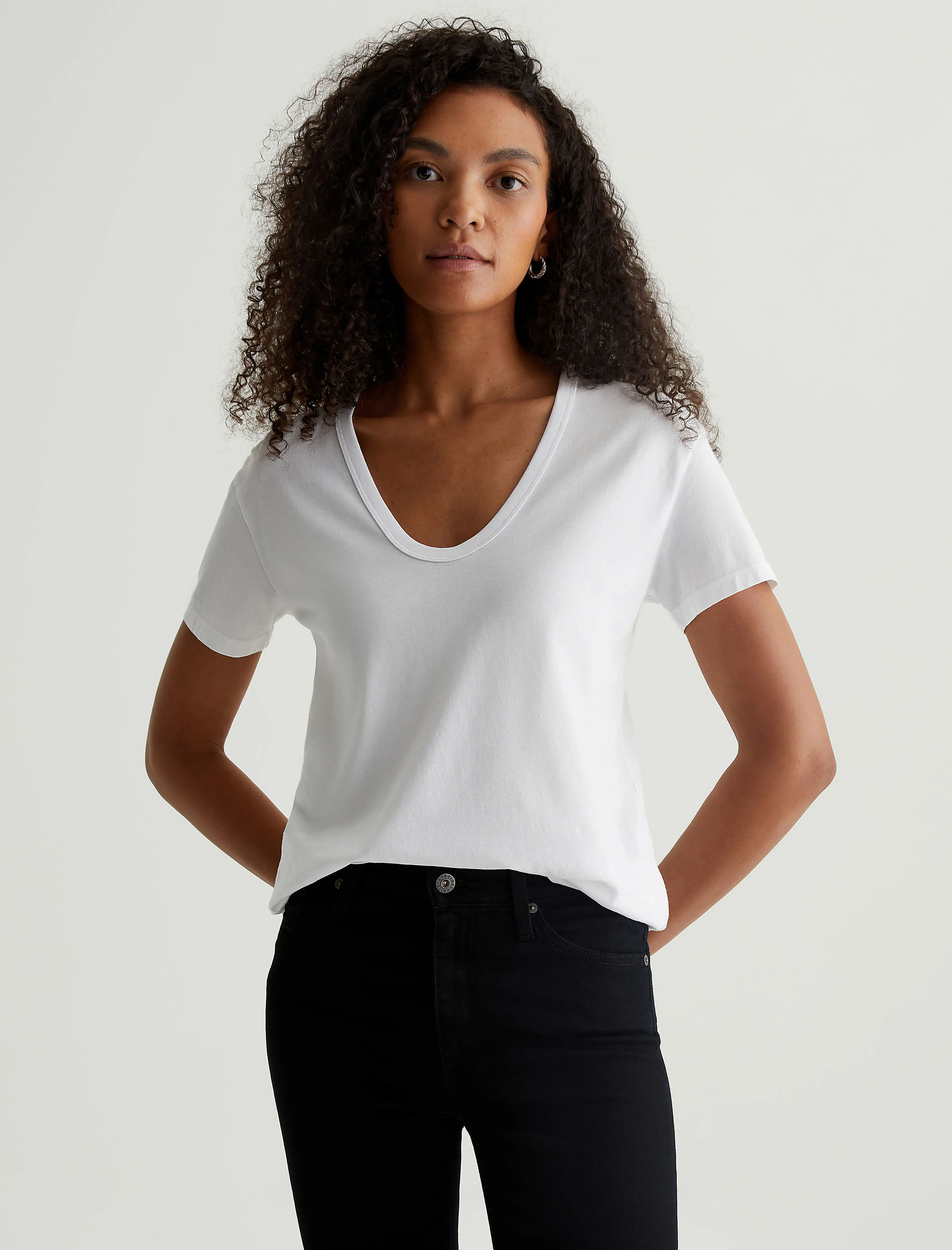 Relaxed U Neck Aspen U-Neck is our classic U-neck tee that has a very easy neckline with a touch of femininity. The white tee offers a relaxed fit with a slightly dropped shoulder. An easy styling piece to dress up or down with a vintage style jean. Our Jersey Knit offers a luxurious comfort that is unrivaled—knitted with both S-twist and Z-twist yarn to sustain longevity and stability, preventing unnecessary twisting and torquing. During the production process, the S-twist yarn is spun counter-clockwise creating a right-handed twill. The Z-twist yarn works in opposition, spinning clockwise for a left-handed twill. This opposition—when working together—yields a softer, more durable fabrication and gives strength to the yarn making it more difficult to pull apart. Designed in 100% Cotton. DETAILS & FIT Model is wearing size S. - Body Length: 25" - Chest Width: 36" - Sleeve Length: 6" FABRIC & CARE Essential Light Jersey, 4.5 Oz. 100% Cotton