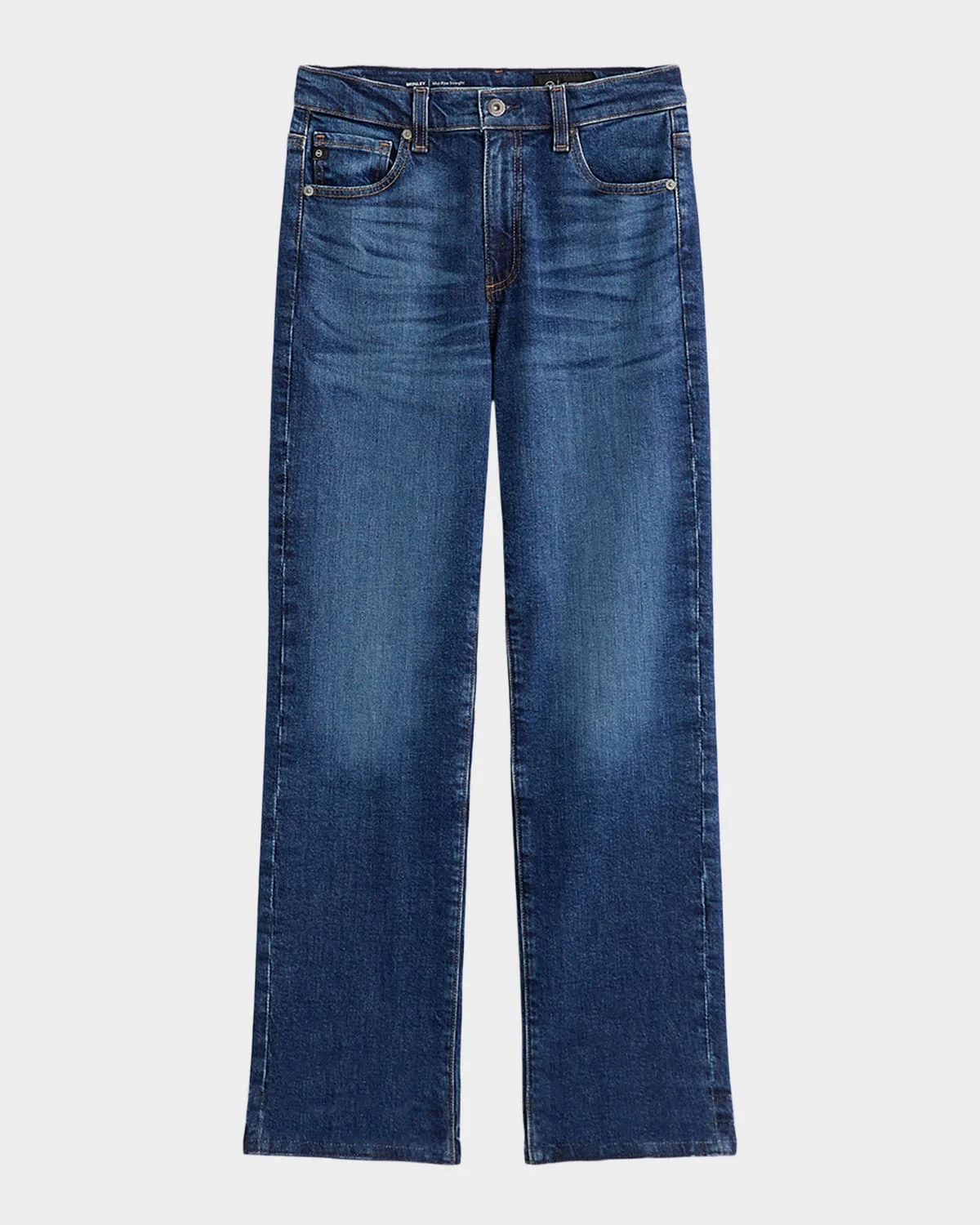 AG Jeans "Brinley" straight-leg jeans crafted from comfort-stretch denim & nbsp; Approx. 10.3" rise; 29.5" inseam Mid-rise; sits high on the hip & nbsp; Five-pocket style Easy fit Full length Button/zip fly; belt loops Cotton/elastane Machine wash cold Imported