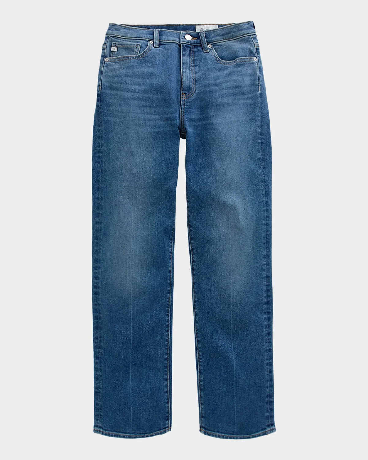 These "Brinley" jeans from AG Jeans are crafted of medium-wash stretch denim, detailed with subtle fading and whiskering Approx. measurements: 10.3" rise; 29.5" inseam Mid-rise sits high on the hips Flat front Five-pocket style Ankle length Straight legs Button/zip fly; belt loops Cotton/polyester/elastane Machine wash cold Imported