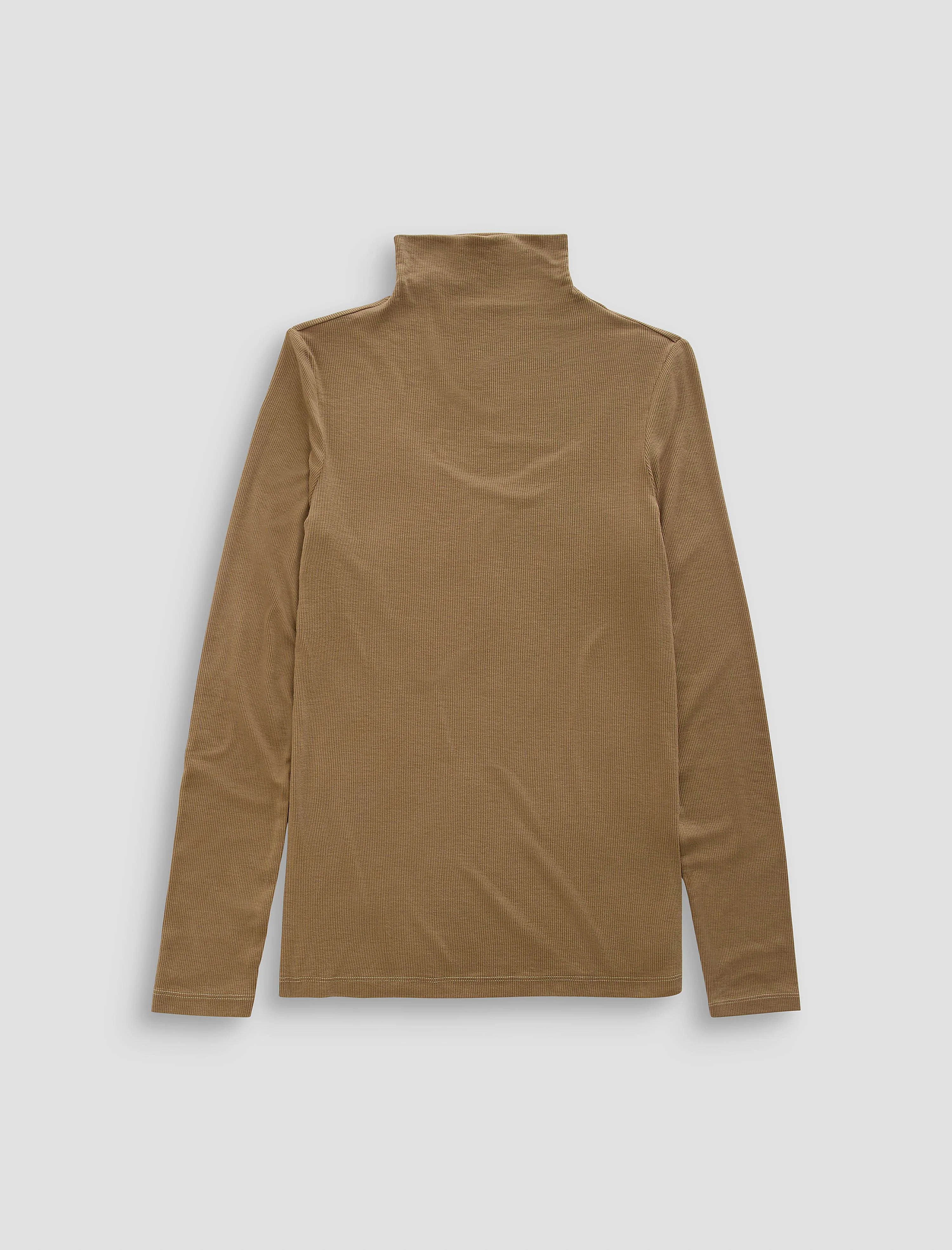 Slim Rib Knit Chels is a slim-fit turtleneck beloved for its thin, buttery soft ribbed construction knitted from 2x1 Lyocell Rib. Your go-to turtleneck that's lightweight for easy layering and flattering when worn on its own. With a comfortable yet contoured fit, this top feels like a second skin. Designed in a neutral beige color, Khaki Sand. DETAILS & FIT Model is wearing size S. - Body Length: 25" - Chest Width: 32" - Sleeve Length: 25" FABRIC & CARE 2x1 Lyocell Rib, 96% Lyocell, 4% Spandex/Elastane