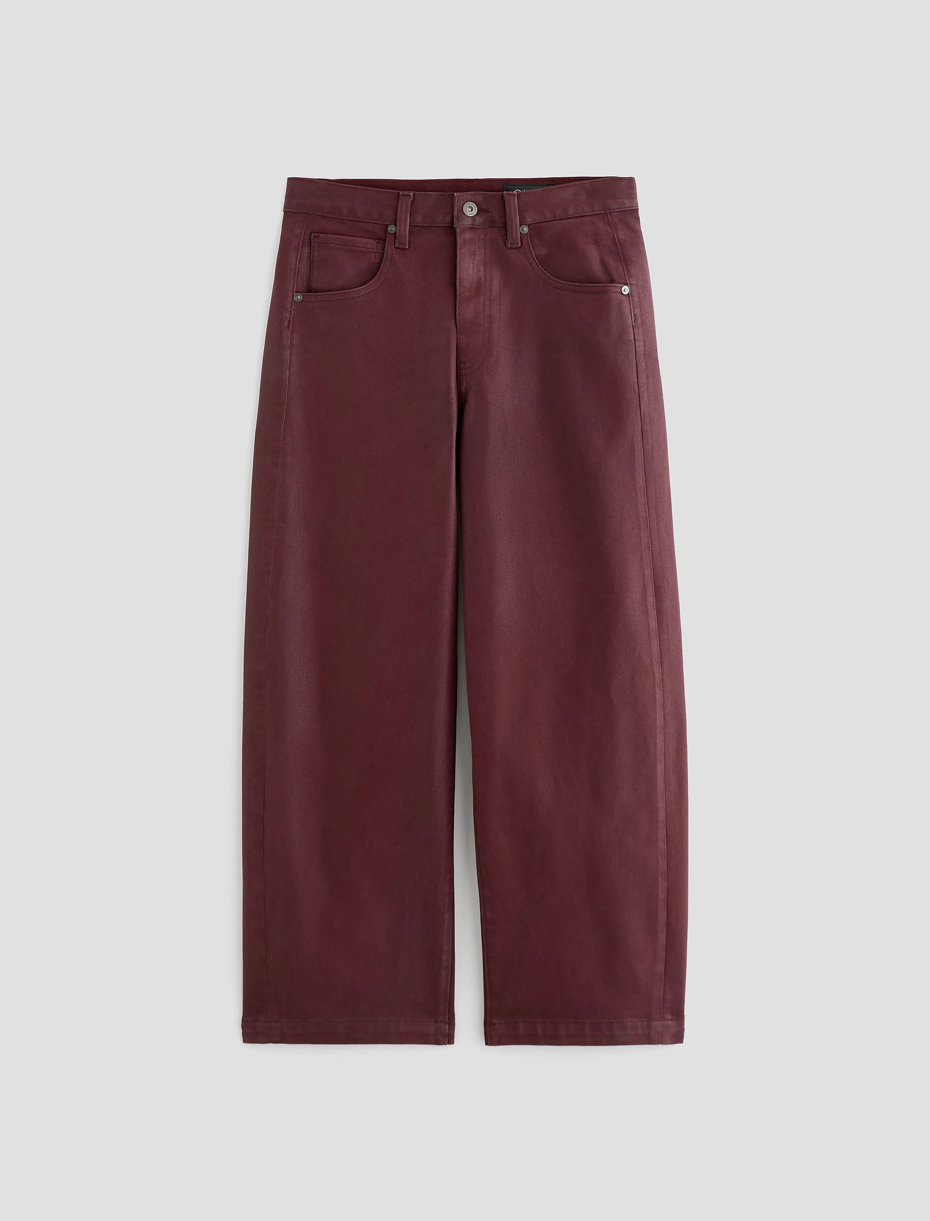 Coated Denim High-Rise Barrel The Hattie Crop is a high-rise barrel jean with a cropped hem that hits just above the ankle for a modern, easy-to-style look. Designed with curved, voluminous legs that taper at the hem, this silhouette brings a fresh take on relaxed denim with a sheen coated finish that was hand-finished with an exclusive Leatherette process. Crafted from AG Cloud Soft Denim™, it offers all-day comfort. DETAILS & FIT Model is wearing size 26. - Front Rise: 11 1/2" - Knee Opening: 22" - Bottom Opening: 18 3/4" - Inseam: 26 1/2" FABRIC & CARE AG Cloud Soft Denim™, Hyper Soft Bull Denim, 8.7 Oz. 93% Cotton, 6% Polyester, 1% Elastane