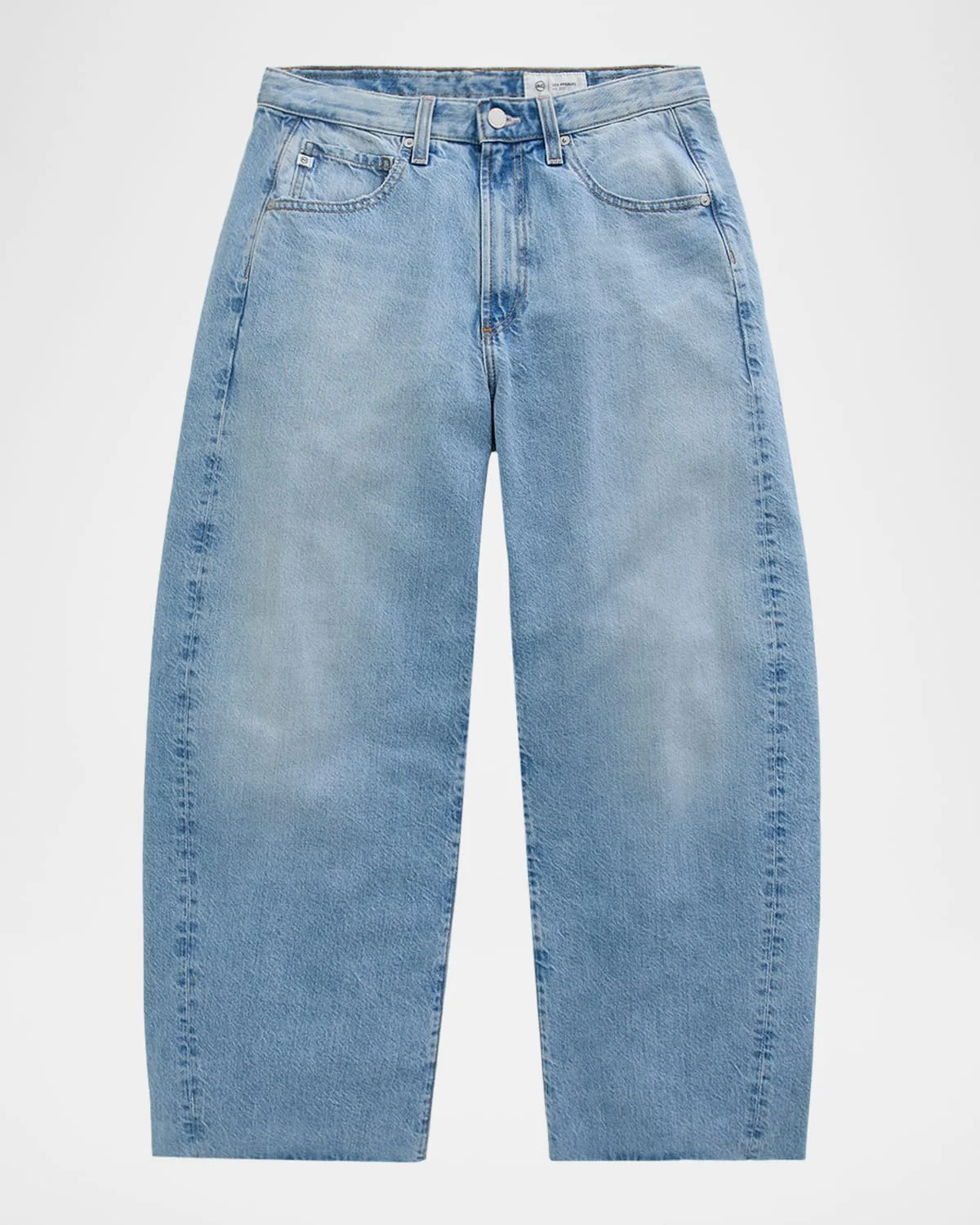 These "Hattie" jeans from AG Jeans are crafted in light-wash comfort stretch denim finished with slightly frayed, raw-cut hems Approx. measurements: 11.5" rise; 27.1" inseam High-rise sits high on the hips Flat front Five-pocket style Raw-cut hems Cropped at the ankle Barrel legs Button/zip fly; belt loops Cotton/lyocell Machine wash cold Made in Mexico