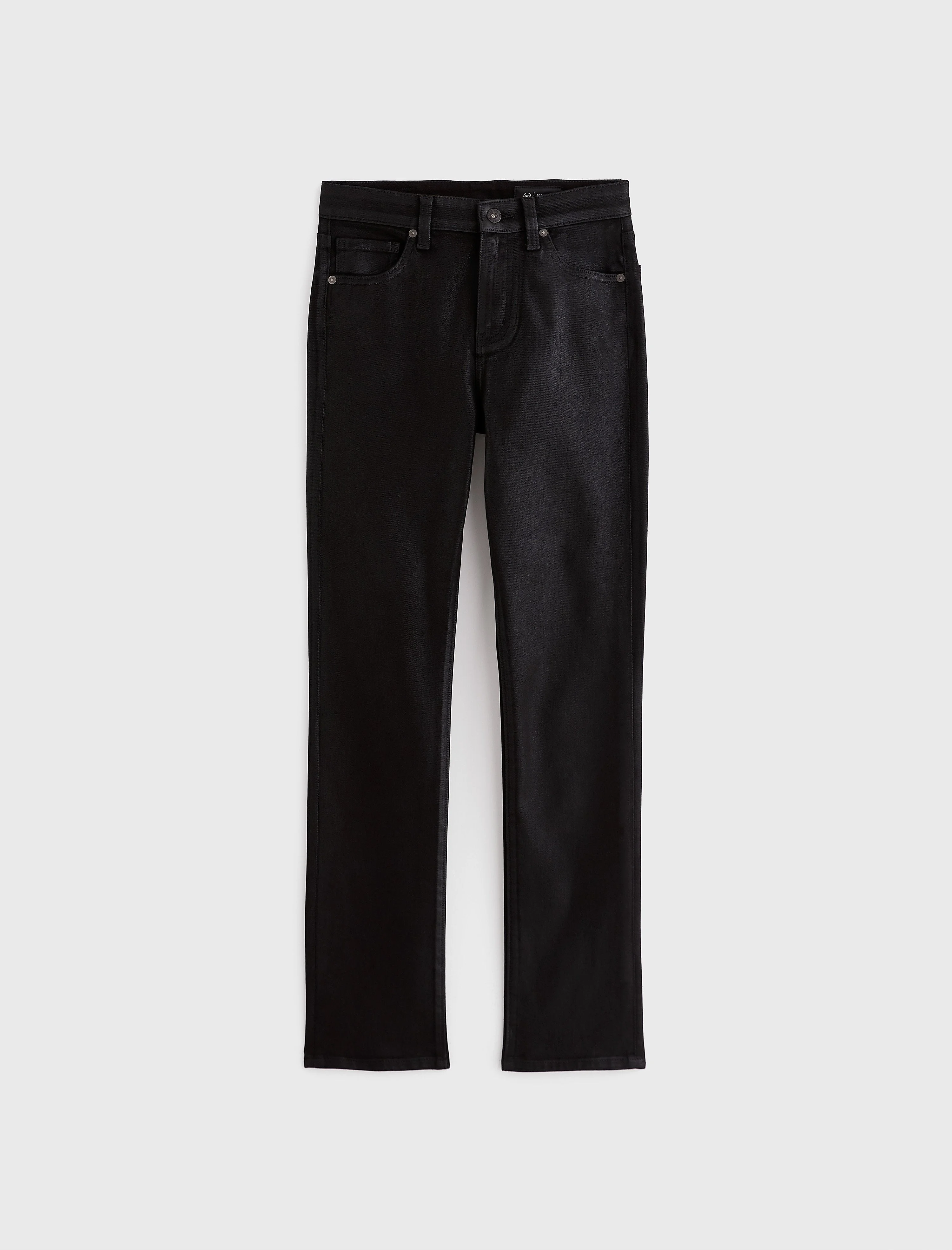 Coated Denim Mid-Rise Slim Straight The Mari mid-rise straight leg jean for women features a leatherette-coated black hue. Mari offers a flattering mid-rise waist and fits easy around the hips, finished with a straight leg and subtle slim leg opening. This women’s straight jean is designed in 8.7 oz. Hyper Soft Bull Denim, an exclusive AG Cloud Soft Denim™ fabric. This special left-hand twill allows the yarns to gently relax and untwist for a luxe, supple feel. It's designed to get even softer the more you wear it. There's dual-elastic stretch built in for extra comfort and powerful recovery. DETAILS & FIT Model is wearing size 26. - Front Rise: 9 3/4" - Knee Opening: 14" - Bottom Opening: 13" - Inseam: 29" FABRIC & CARE AG Cloud Soft Denim™, Hyper Soft Bull Denim, 8.7 Oz. 93% Cotton, 6% Polyester, 1% Elastane